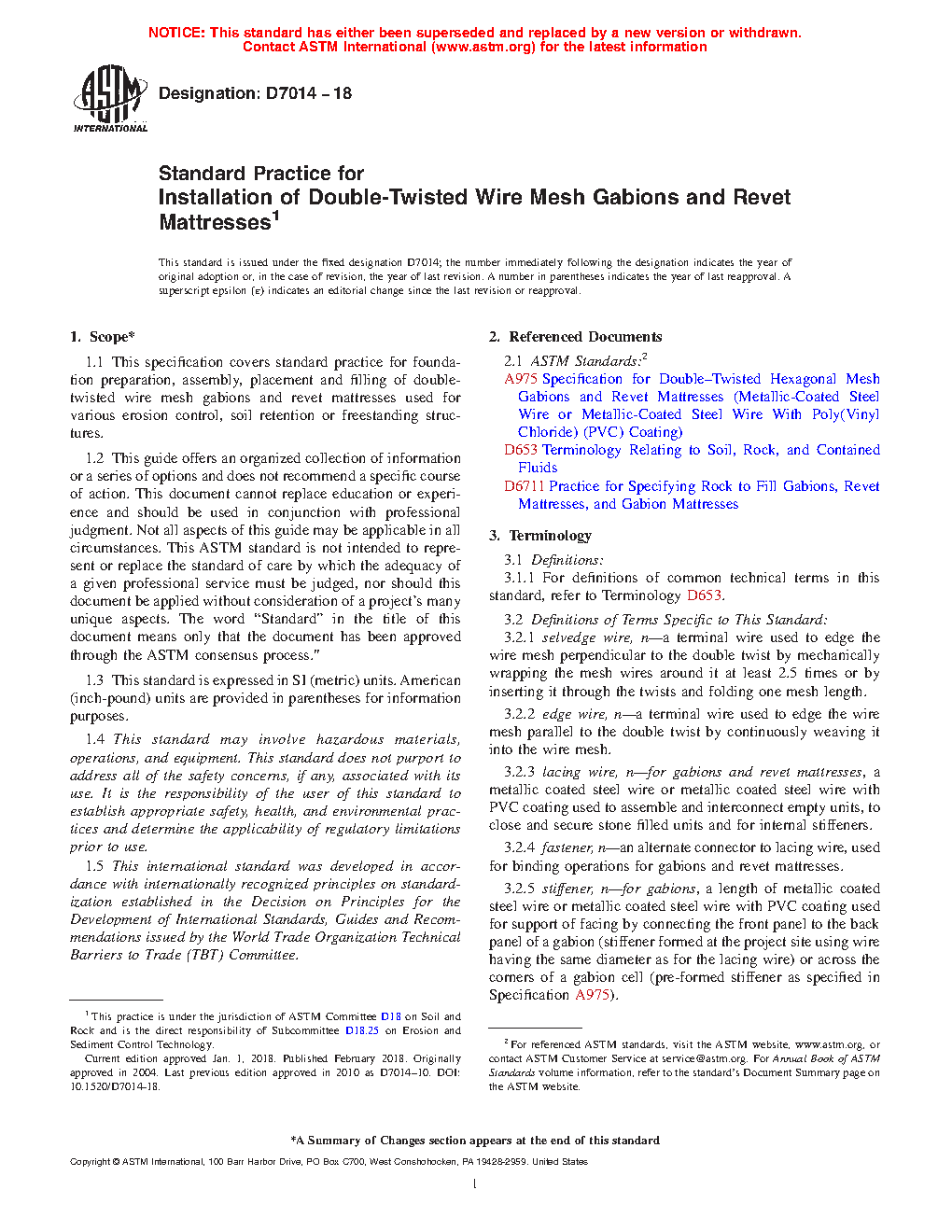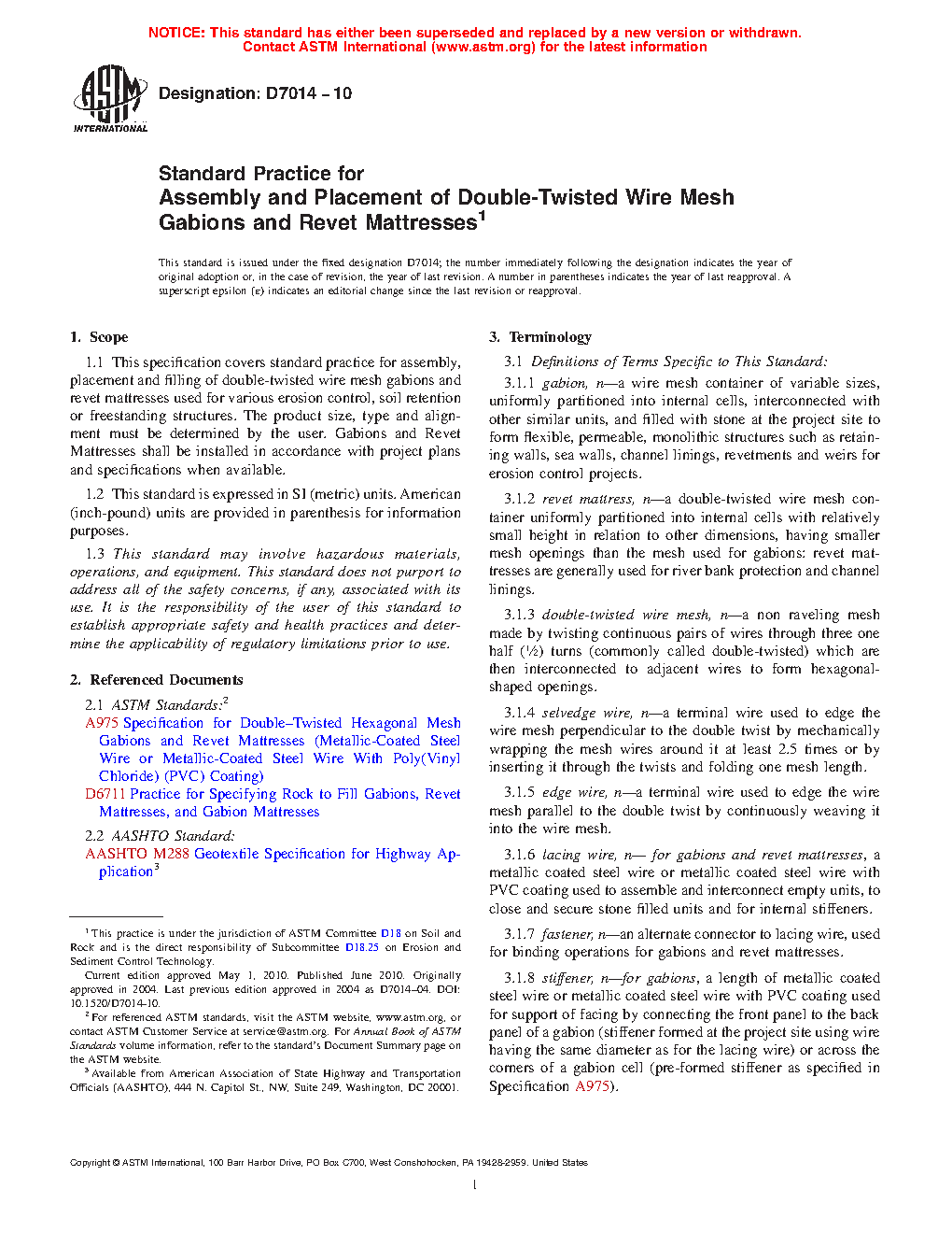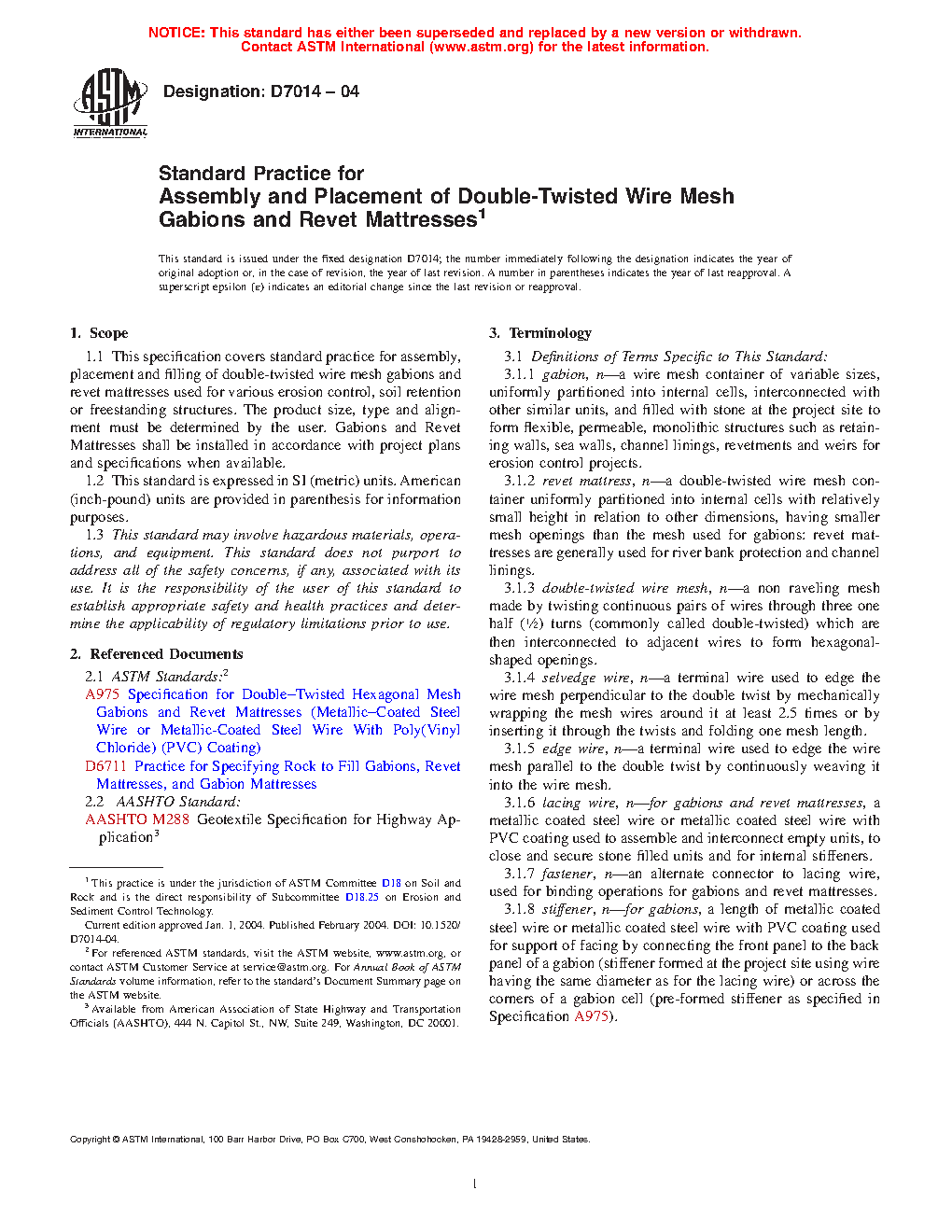 1.1 This specification covers standard practice for foundation preparation, assembly, placement and filling of double-twisted wire mesh gabions and revet mattresses used for various erosion control, soil retention or freestanding structures.