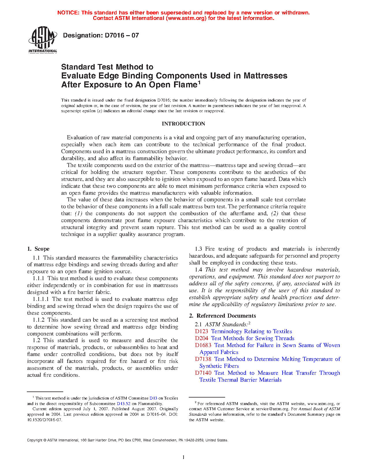 1.1.1 This test method is used to evaluate these components either independently or in combination for use in mattresses designed with a fire barrier fabric.
