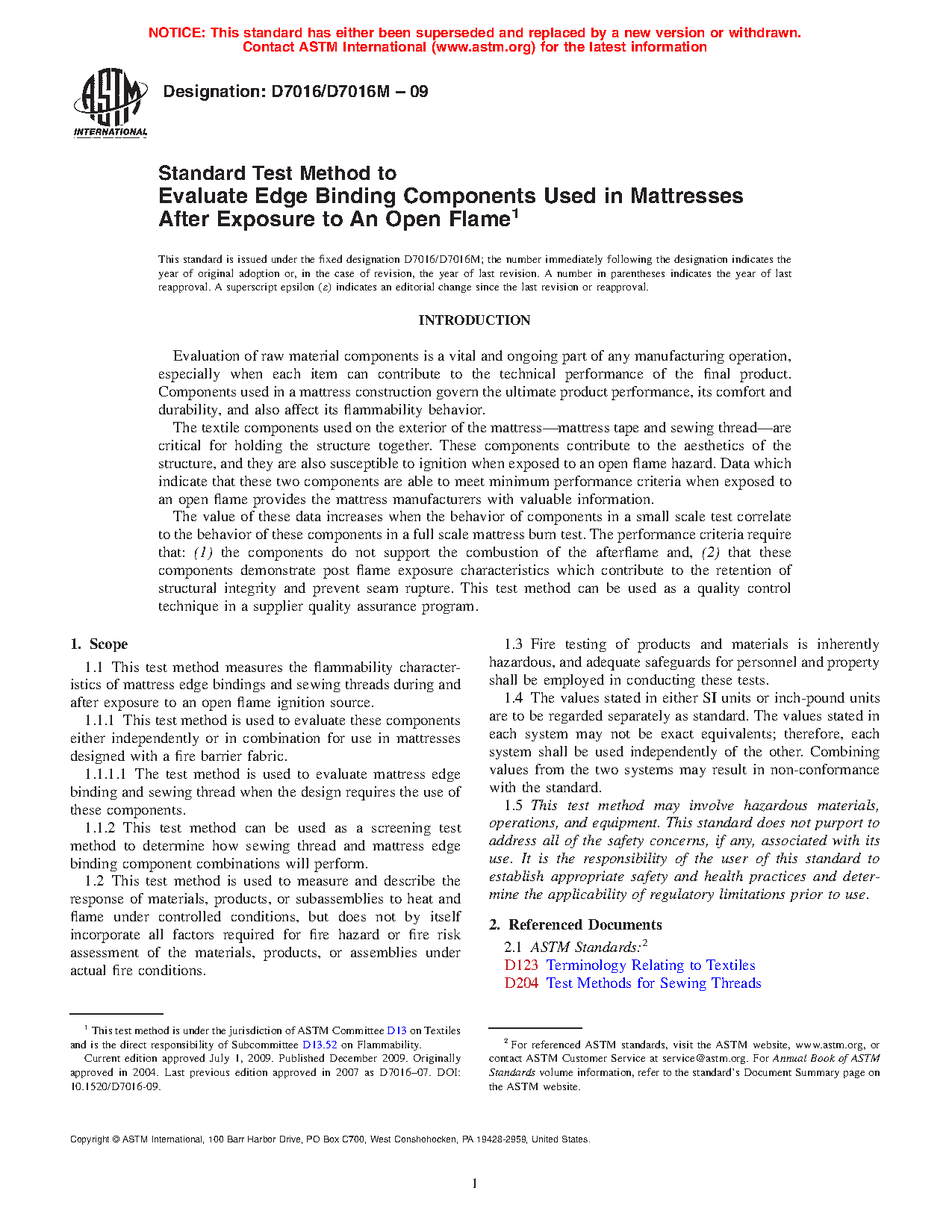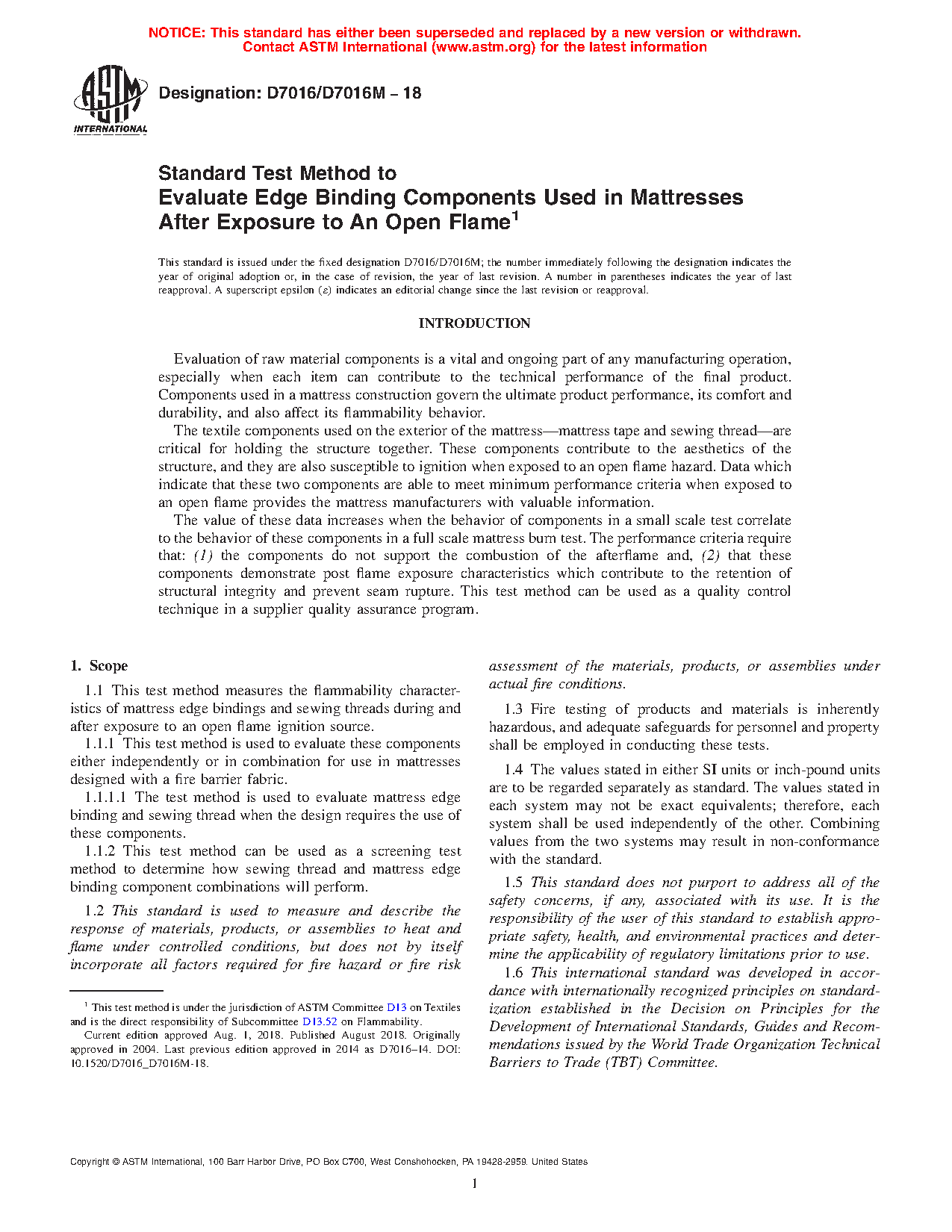 1.1.1 This test method is used to evaluate these components either independently or in combination for use in mattresses designed with a fire barrier fabric.