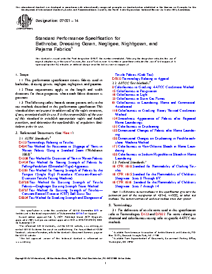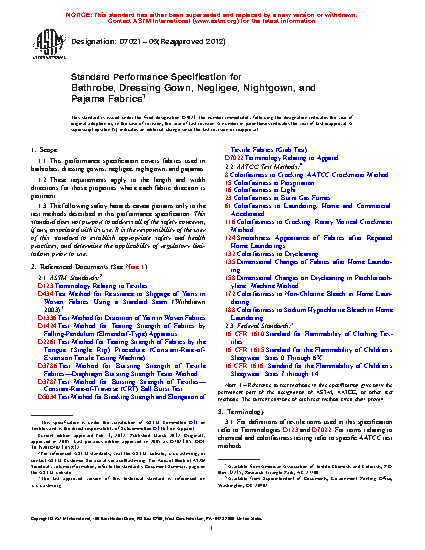 1.1 This performance specification covers fabrics used in bathrobes, dressing gowns, negligee, nightgown, and pajamas.