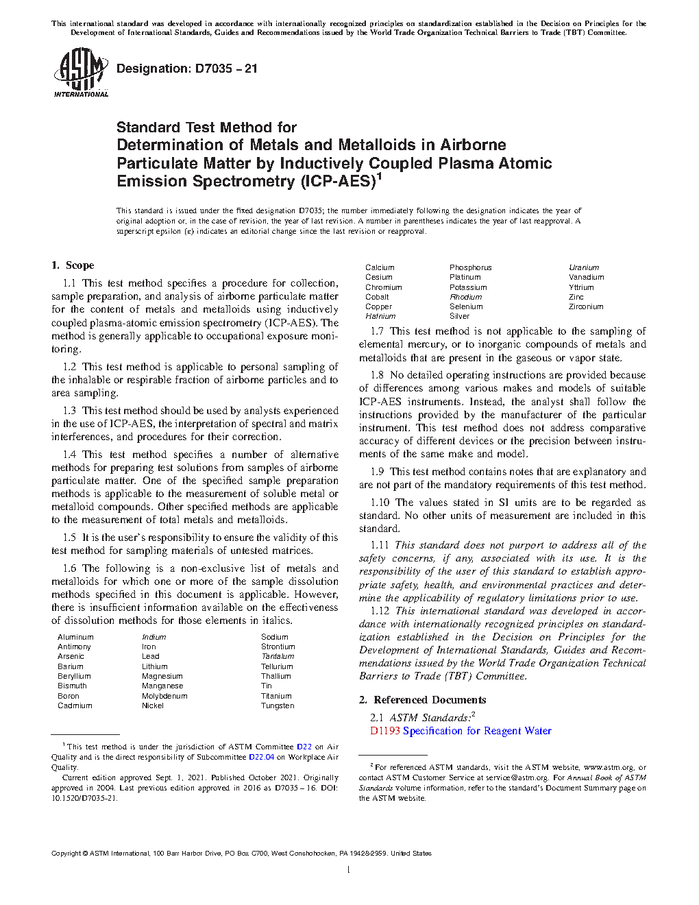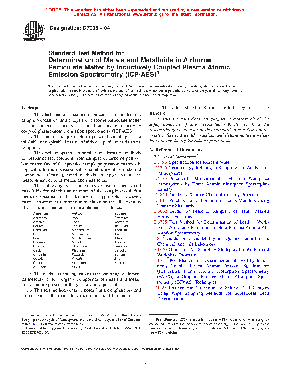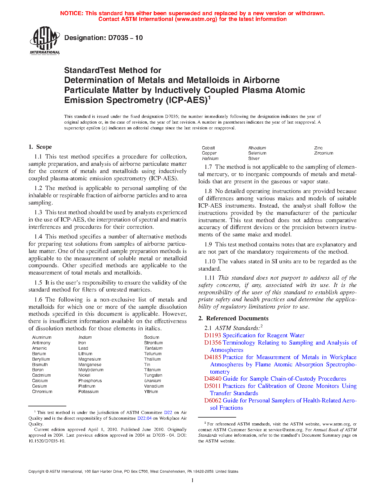 1.1 This test method specifies a procedure for collection, sample preparation, and analysis of airborne particulate matter for the content of metals and metalloids using inductively coupled plasma-atomic emission spectrometry (ICP-AES).