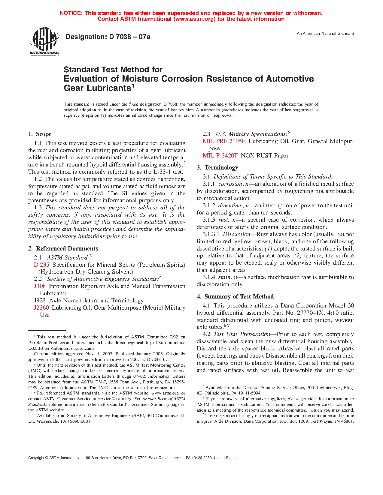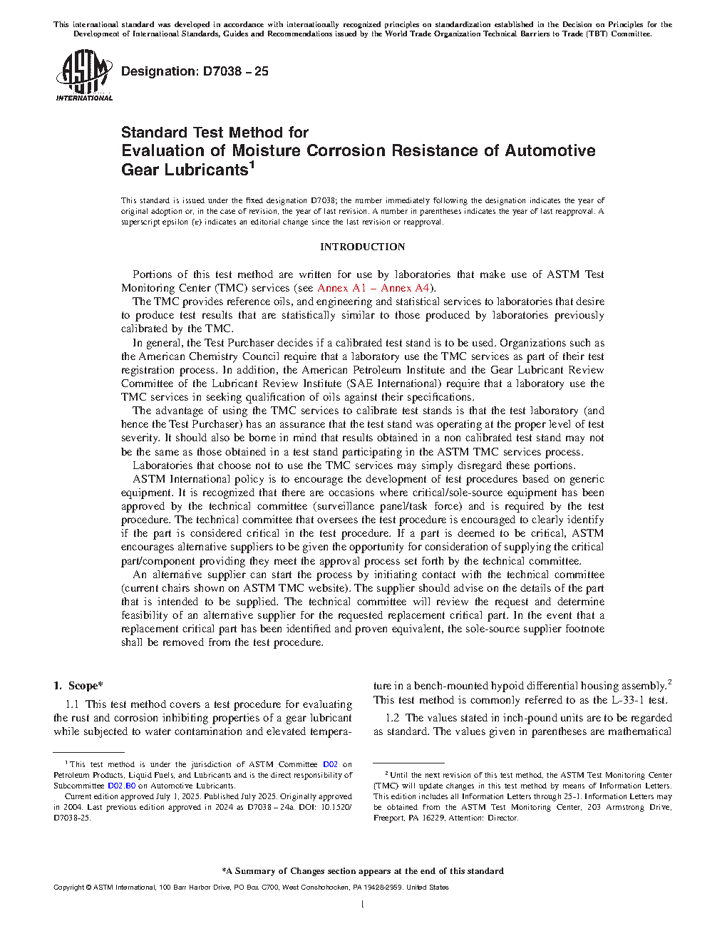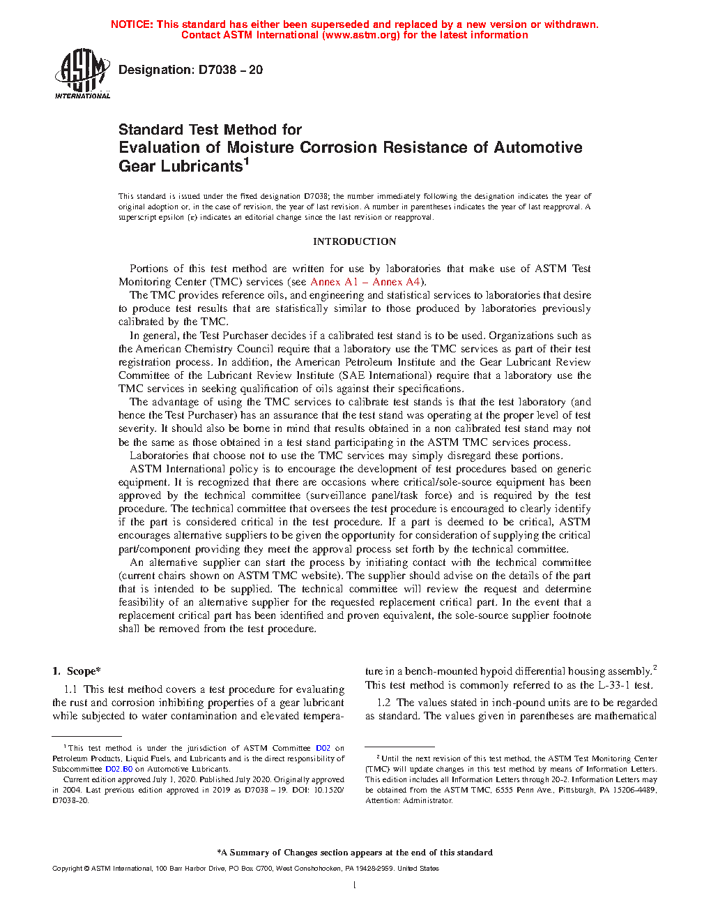 1.1 This test method covers a test procedure for evaluating the rust and corrosion inhibiting properties of a gear lubricant while subjected to water contamination and elevated temperature in a bench-mounted hypoid differential housing assembly.2 This test method is commonly referred to as the L-33-1 test.