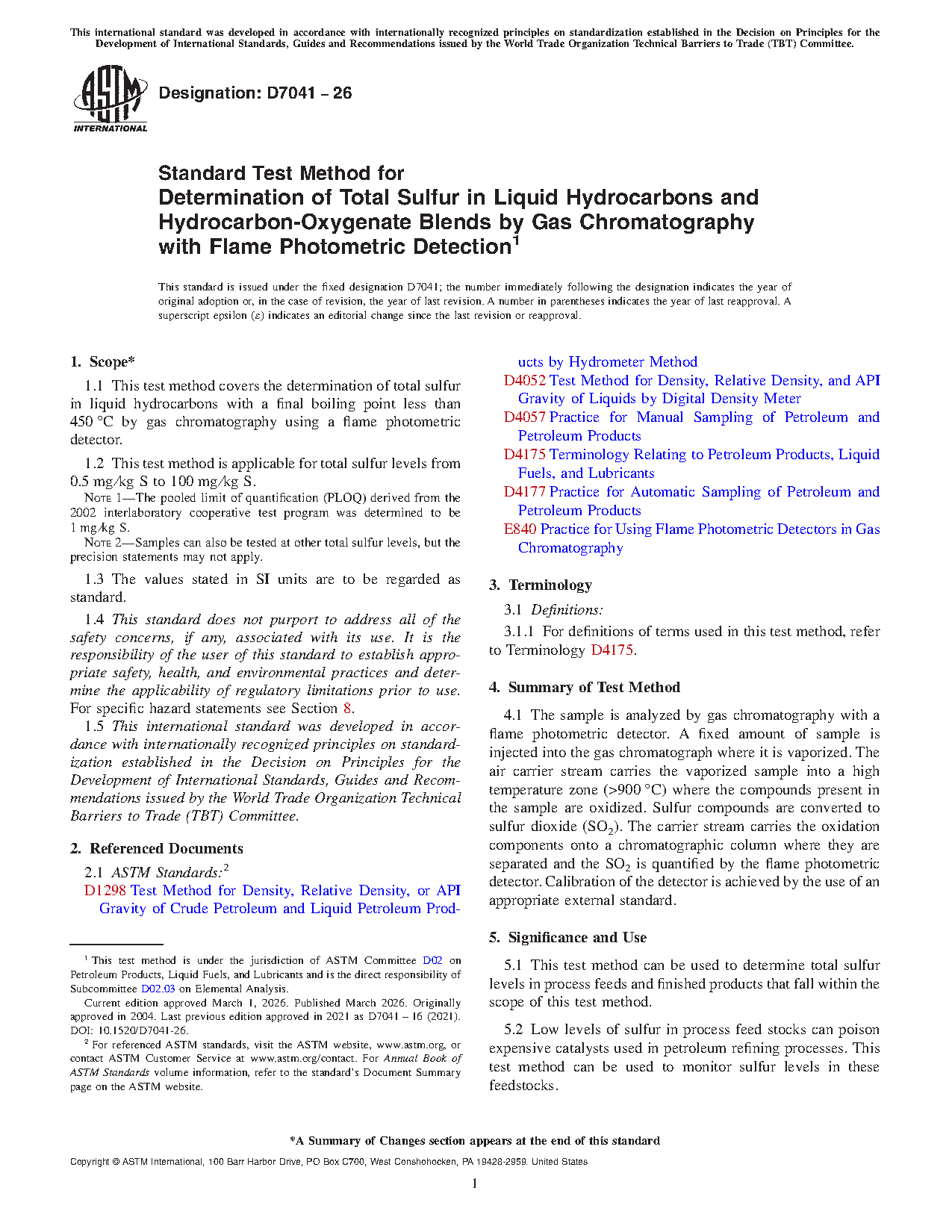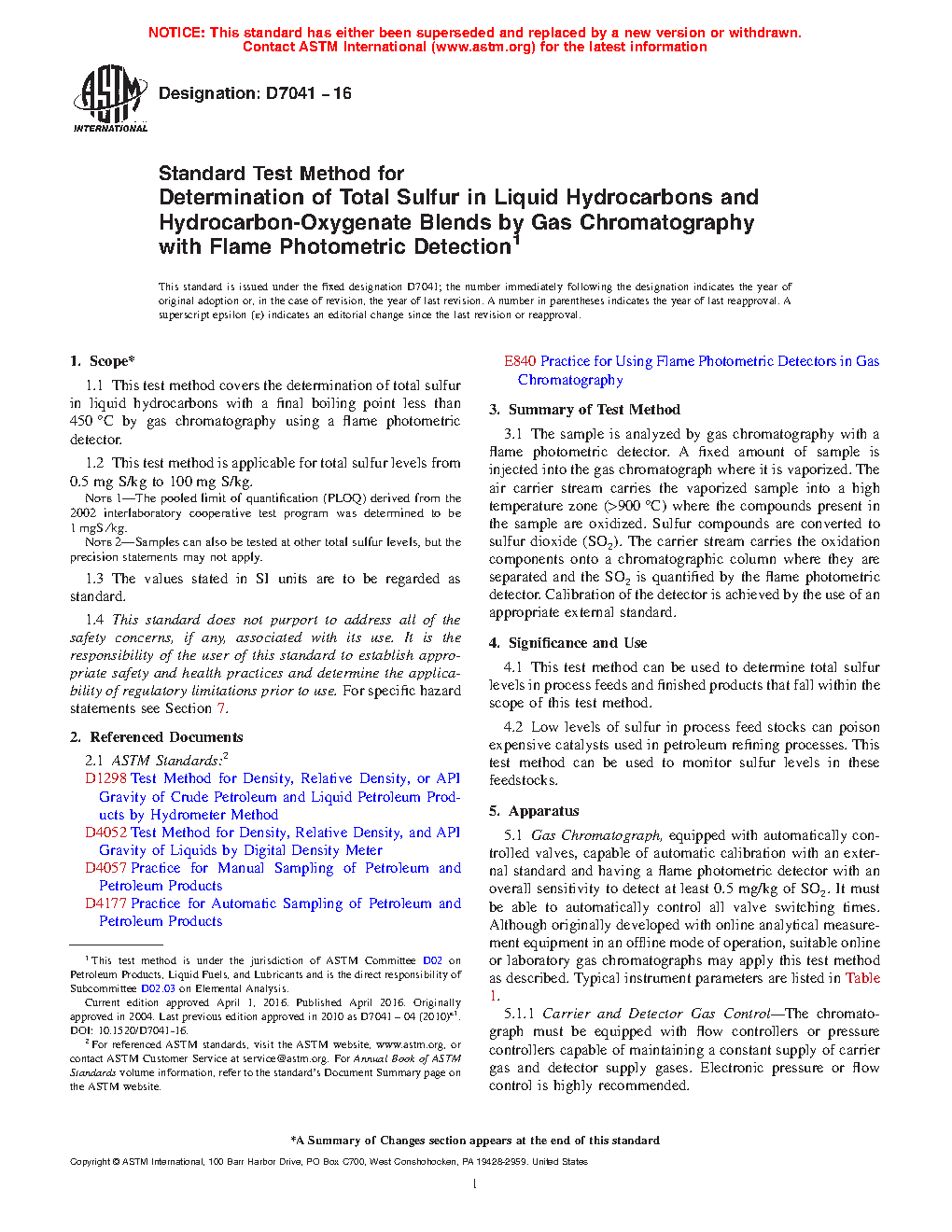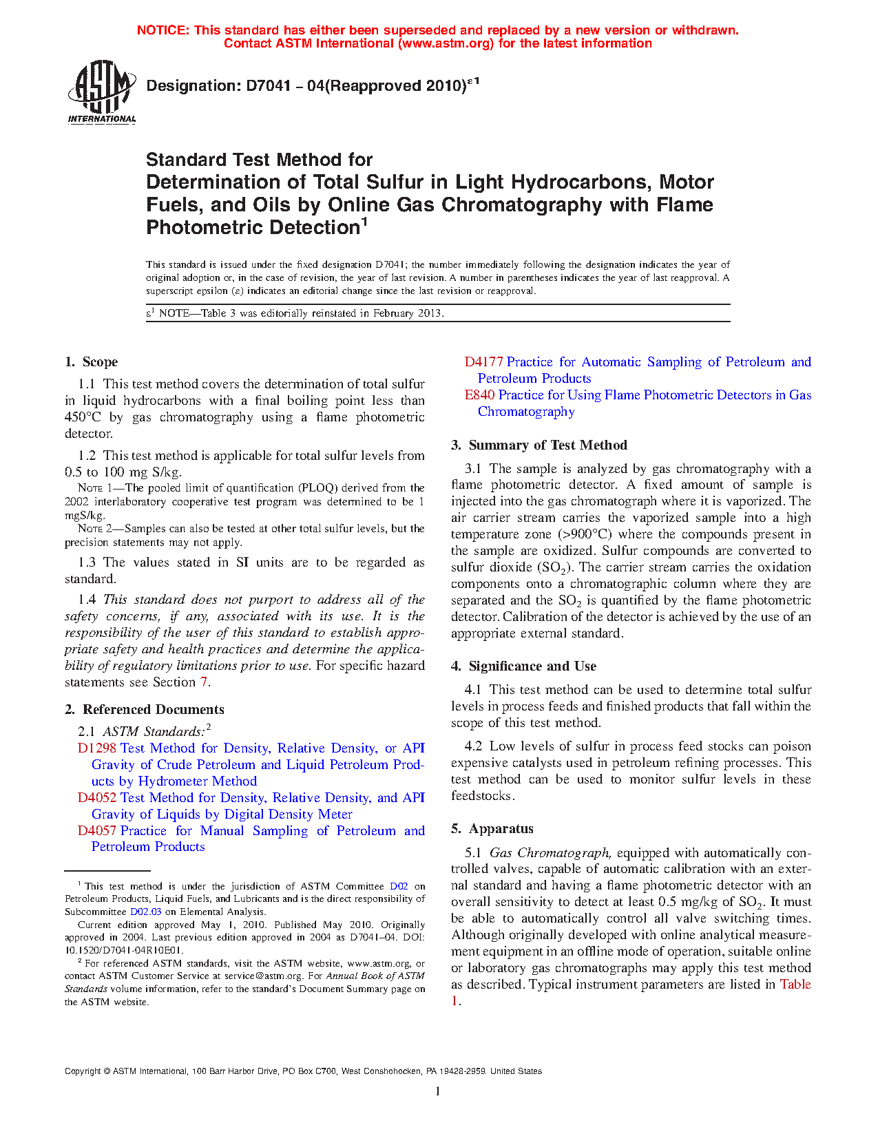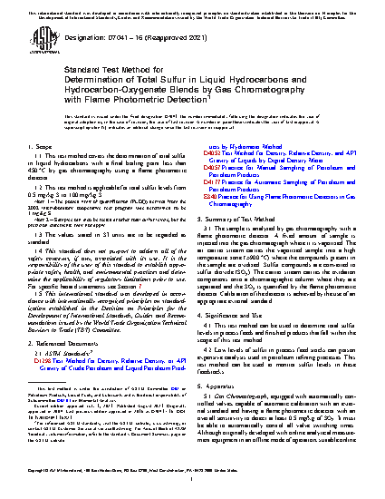 1.1 This test method covers the determination of total sulfur in liquid hydrocarbons with a final boiling point less than 450°C by gas chromatography using a flame photometric detector.