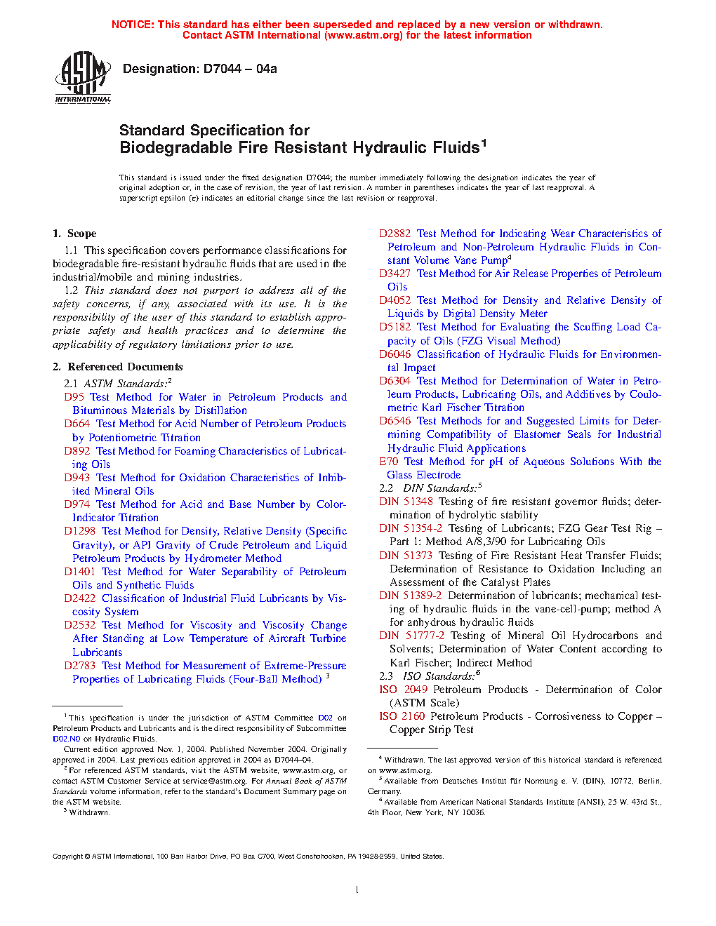 This specification presents the performance classifications for biodegradable fire-resistant hydraulic fluids that are used in the industrial/mobile and mining industries. Covered here are seven material classes, as follows: HFA are fire resistant hydraulic fluids that may be further classified as HFAE, which are oil-in-water emulsions, and HFAS, which are chemical solutions not containing any emulsions; HFB, which are water-in-oil emulsions; HFC, which are aqueous monomer and polymer polyglycol solutions; HFD, which are phosphate ester or polyolester-based, water-insoluble fire-resistant fluids; HFDR, which are phosphate ester-based fluids; HFDU, which arewater-free fluids based on chemical compounds other than phosphate esters and chlorinated hydrocarbons; and HEPG, which are anhydrous "environmentally friendly" polyalkylene glycol-derived hydraulic fluids that may be water soluble or insoluble.