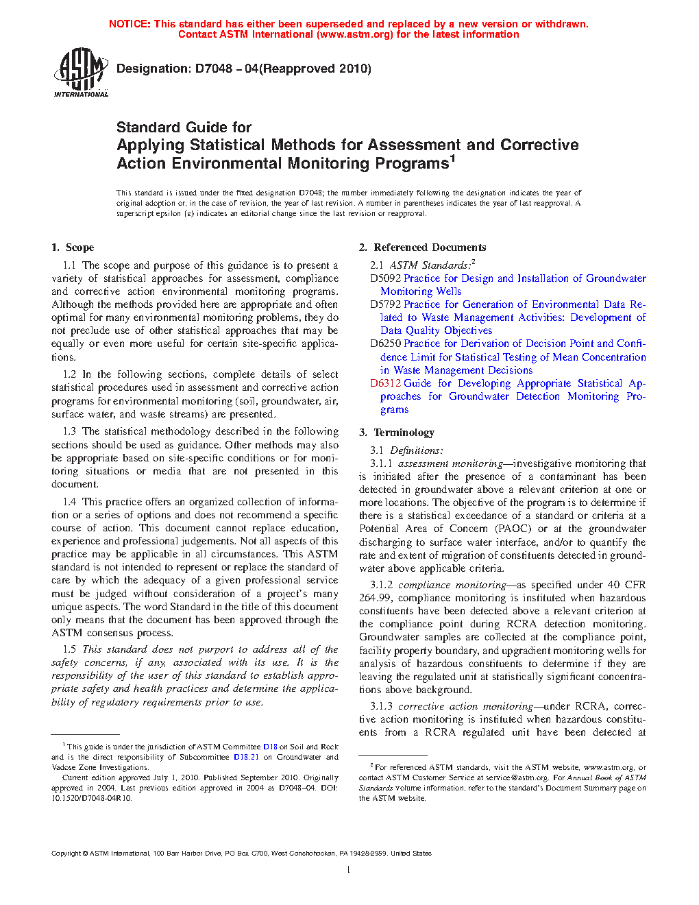 5.4 Statistical methods for detection monitoring have been well studied in recent years (see Gibbons, 1994a, 1996, USEPA 1992 (2, 4, 5) and Practice D6312, formerly PS 64-96 authored by Gibbons, Brown and Cameron, 1996). Although equally important, statistical methods for assessment monitoring, Phase I and II Investigations, on-going monitoring and corrective action monitoring have received less attention, (Gibbons and Coleman, 2001) (6).