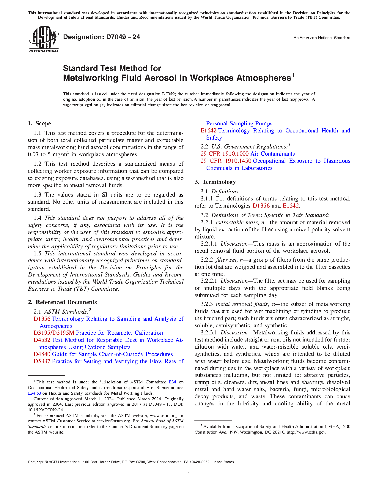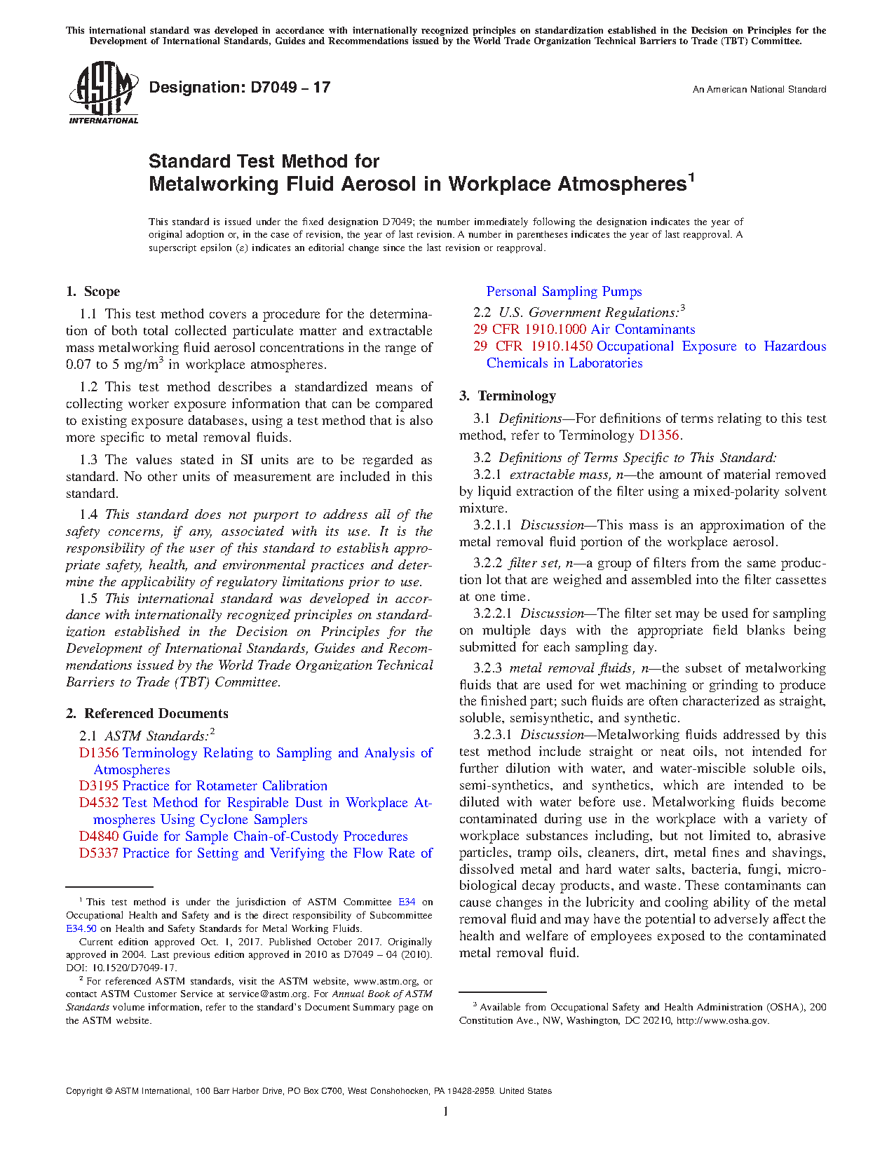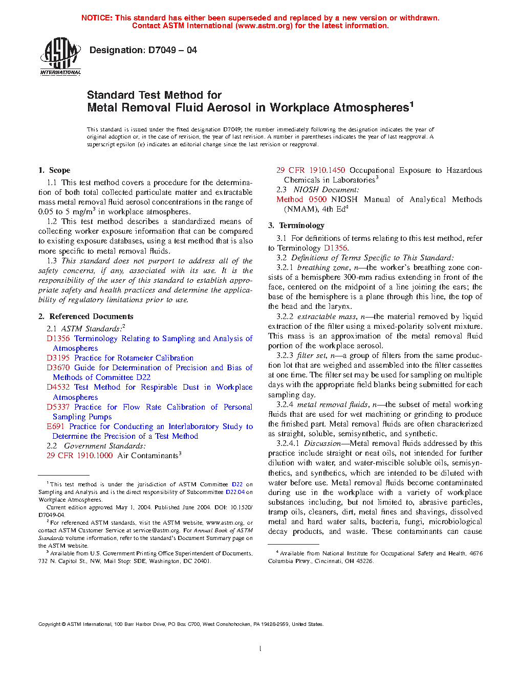 5.1 This test method covers the gravimetric measurement4 of metal removal fluid aerosol concentrations in workplace atmospheres.
