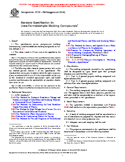 This specification covers the testing and requirements for two types of compression-molding, thermosetting urea-formaldehyde molding compounds. Type 1 are general purpose molding compounds with alpha-cellulose fillers, while, Type 2 are general purpose molding compounds with cellulose fillers other than alpha-cellulose. The molding compounds shall be of uniform composition, and the apparent density, bulk factor, plasticity, particle size, and color shall be compounded as to conform to the requirements prescribed herein. Also, sampled test specimens shall be examined and conform correspondingly to the following physical requirements: specific gravity; flexural strength; impact resistance; water absorption; dielectric strength; and arc resistance.