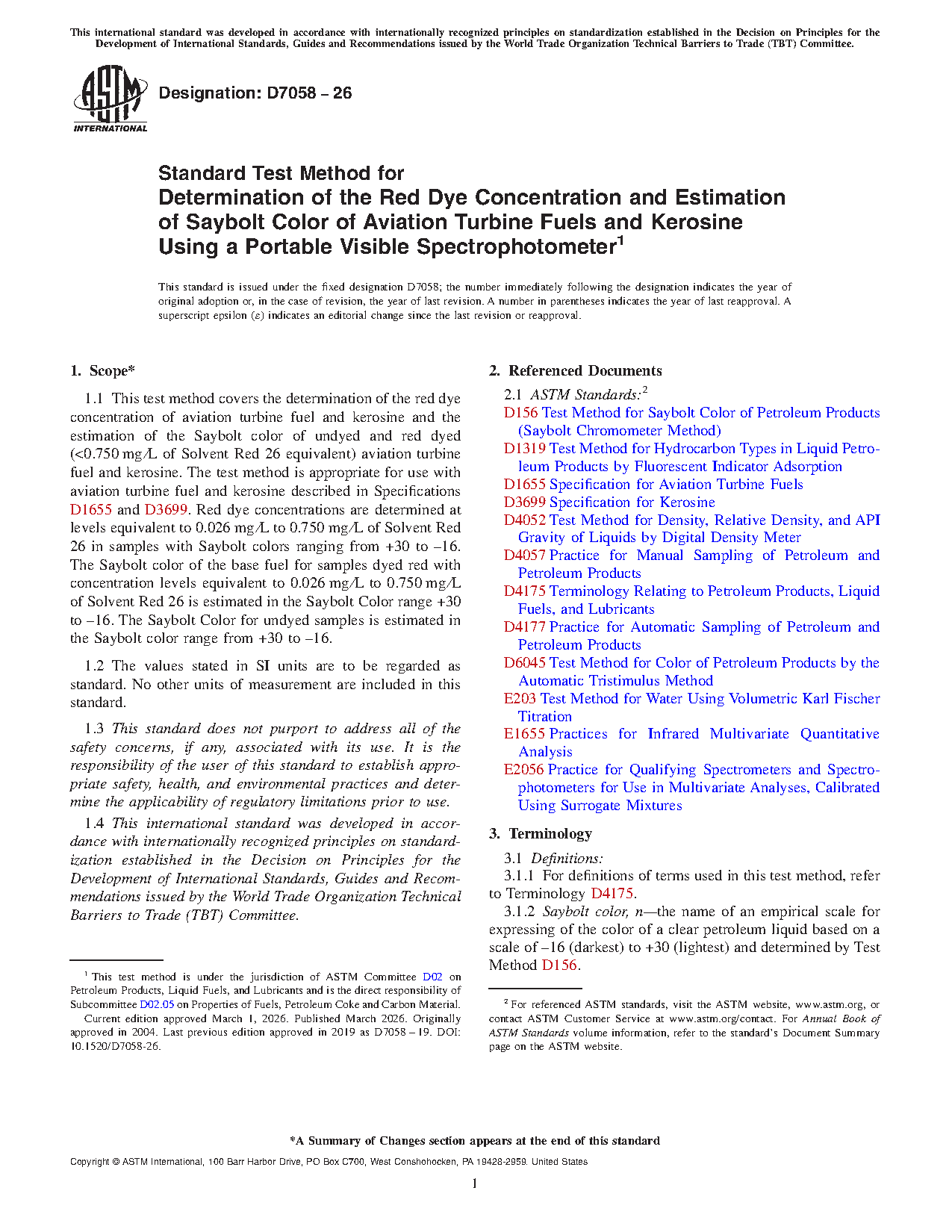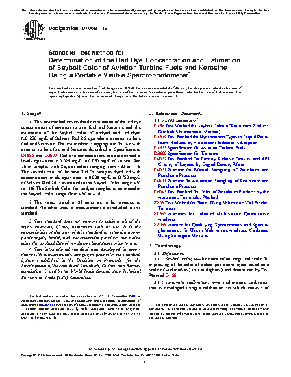 1.1 This test method covers the determination of the red dye concentration of aviation turbine fuel and kerosine and the estimation of the Saybolt color of undyed and red dyed (<0.750 mg/L of Solvent Red 26 equivalent) aviation turbine fuel and kerosine. The test method is appropriate for use with aviation turbine fuel and kerosine described in Specifications D1655 and D3699. Red dye concentrations are determined at levels equivalent to 0.026 mg/L to 0.750 mg/L of Solvent Red 26 in samples with Saybolt colors ranging from +30 to –16. The Saybolt color of the base fuel for samples dyed red with concentration levels equivalent to 0.026 mg/L to 0.750 mg/L of Solvent Red 26 is estimated in the Saybolt Color range +30 to –16. The Saybolt Color for undyed samples is estimated in the Saybolt color range from +30 to –16.