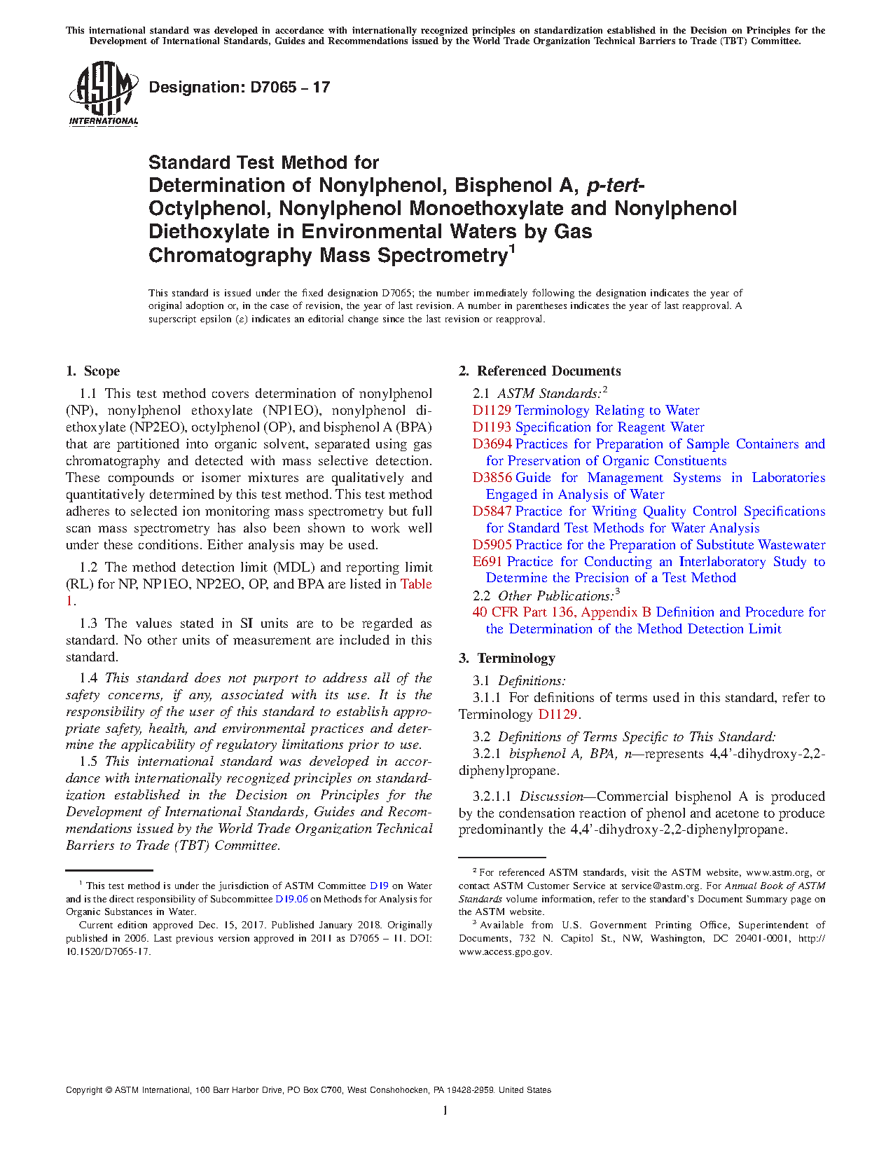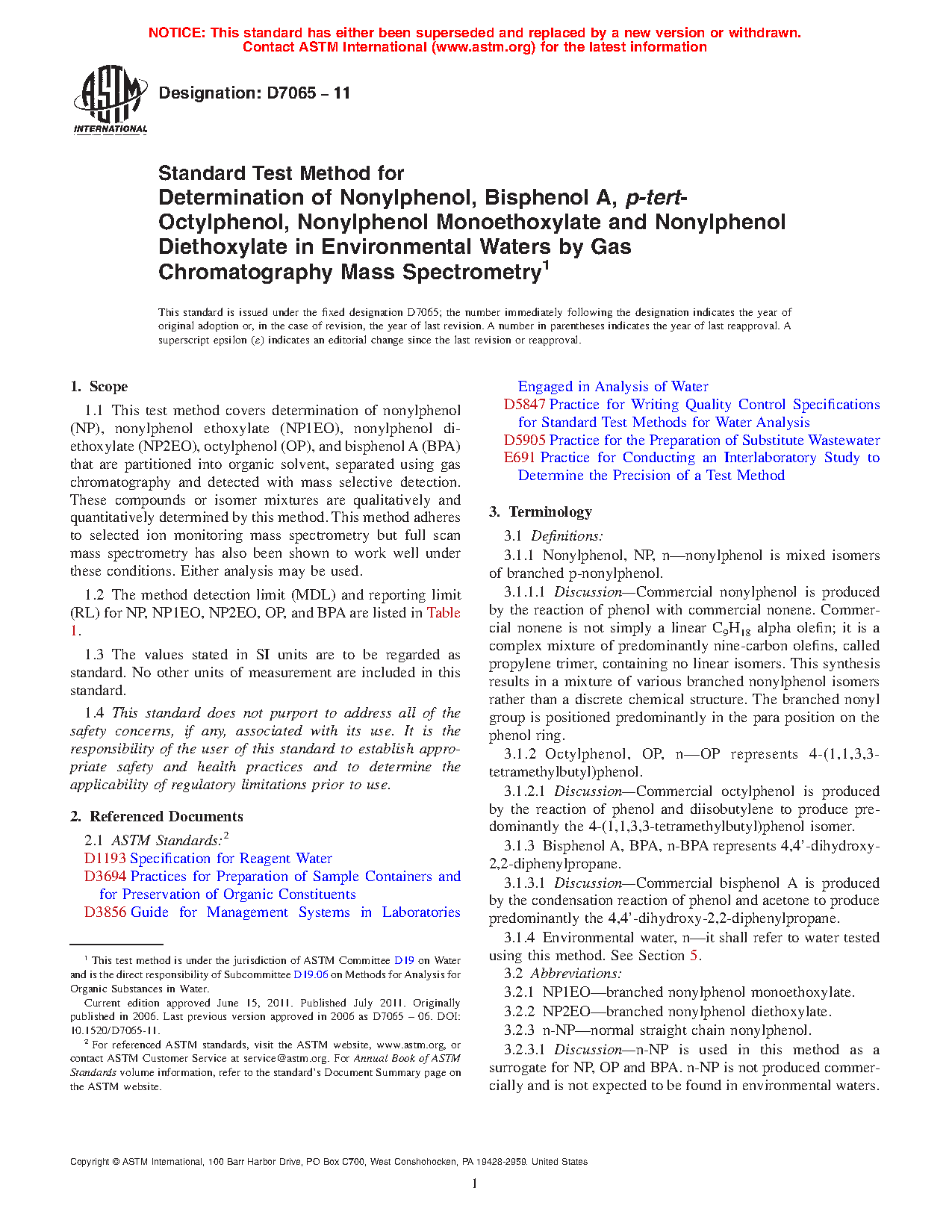 1.1 This test method covers determination of nonylphenol (NP), nonylphenol ethoxylate (NP1EO), nonylphenol diethoxylate (NP2EO), octylphenol (OP), and bisphenol A (BPA) that are partitioned into organic solvent, separated using gas chromatography and detected with mass selective detection. These compounds or isomer mixtures are qualitatively and quantitatively determined by this method. This method adheres to selected ion monitoring mass spectrometry but full scan mass spectrometry has also been shown to work well under these conditions. Either analysis may be used.