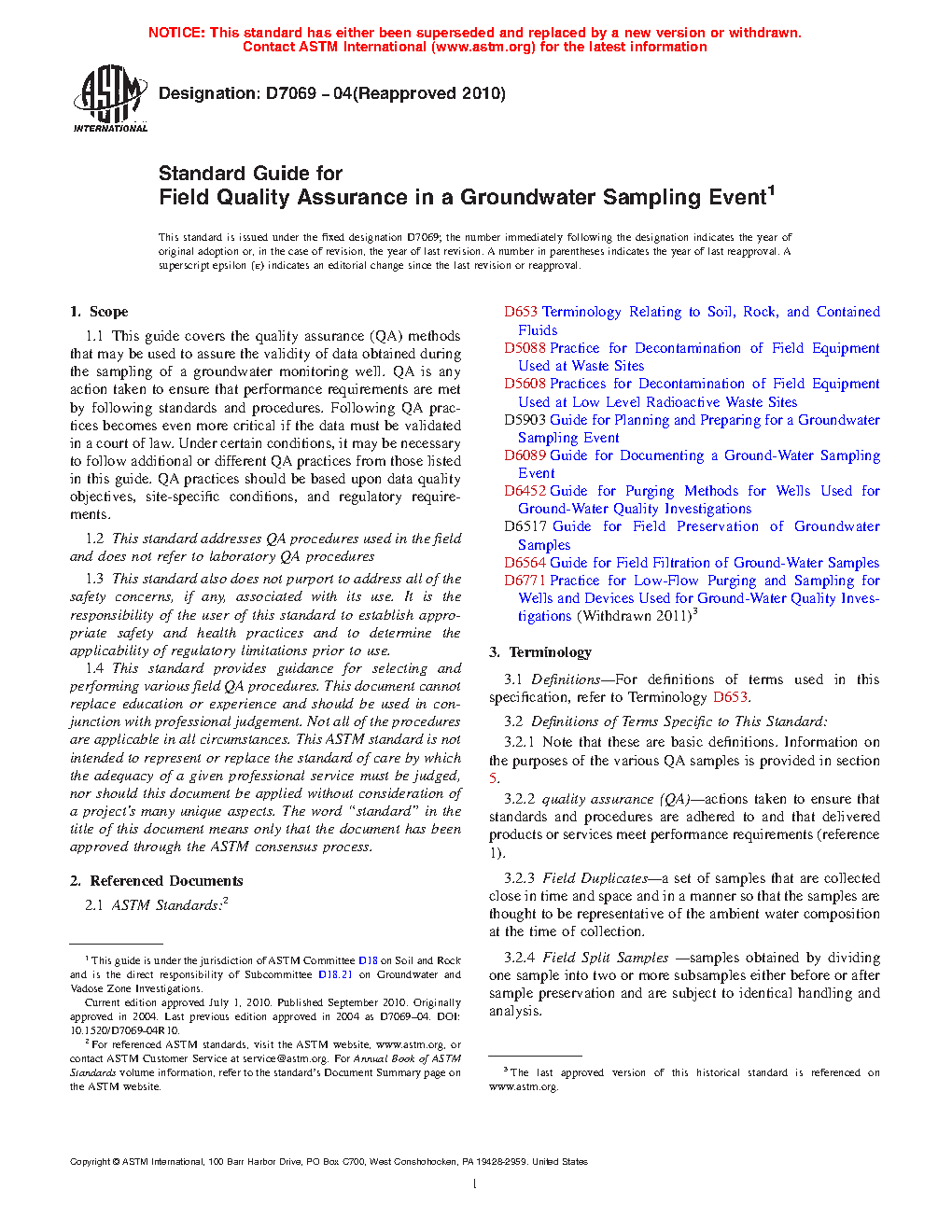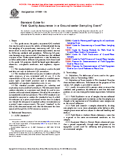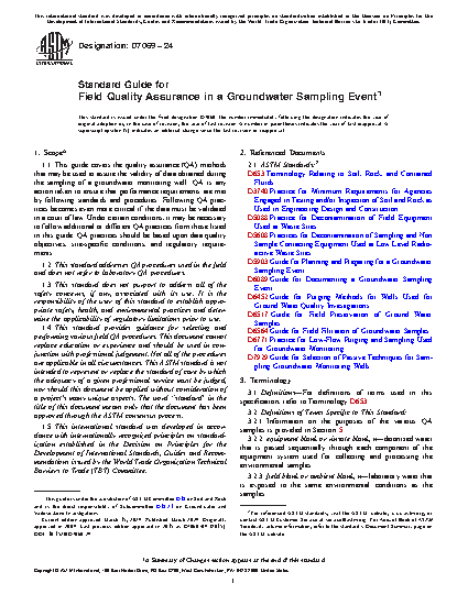 1.1 This guide covers the quality assurance (QA) methods that may be used to assure the validity of data obtained during the sampling of a groundwater monitoring well. QA is any action taken to ensure that performance requirements are met by following standards and procedures. Following QA practices becomes even more critical if the data must be validated in a court of law. Under certain conditions, it may be necessary to follow additional or different QA practices from those listed in this guide. QA practices should be based upon data quality objectives, site-specific conditions, and regulatory requirements.