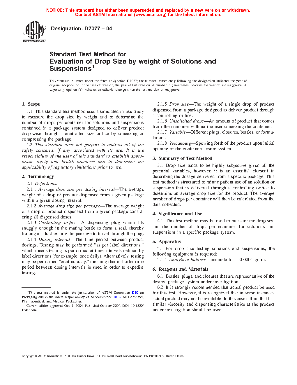 Standard Test Method for Evaluation of Drop Size by weight of Solutions and Suspensions (Withdrawn 2010)