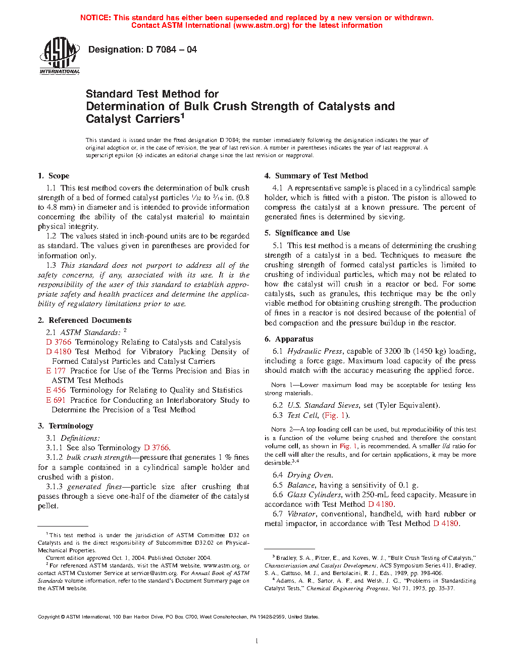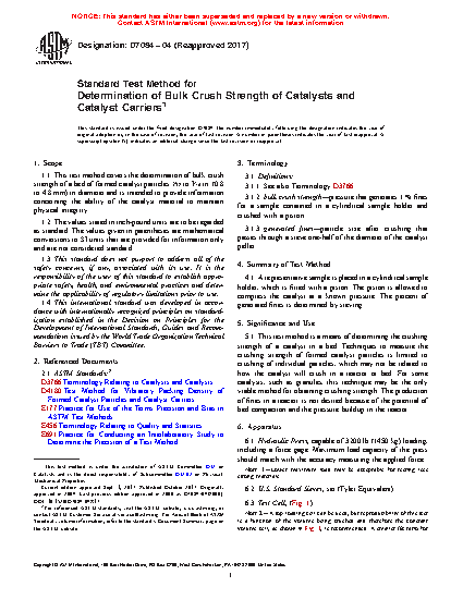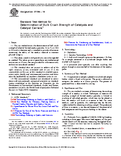 1.1 This test method covers the determination of bulk crush strength of a bed of formed catalyst particles 1/32 to 3/16 in. (0.8 to 4.8 mm) in diameter and is intended to provide information concerning the ability of the catalyst material to maintain physical integrity.