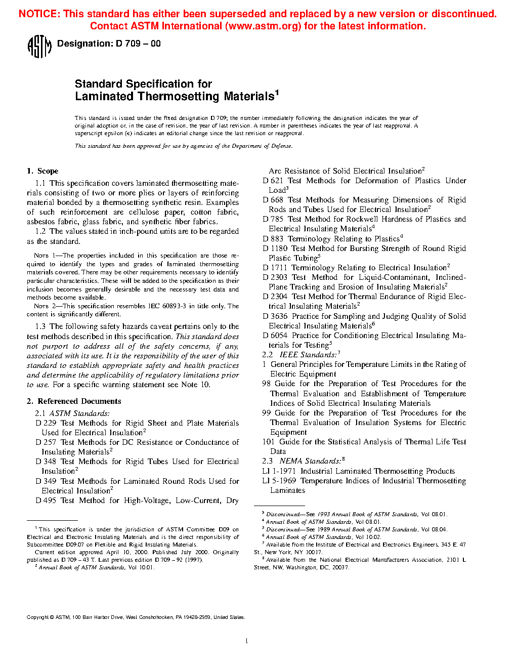 This specification establishes the manufacture, property requirements, and testing of several grades of laminated thermosetting materials consisting of two or more plies or layers of reinforcing material such as cellulose paper, cotton fabric, glass fabric, and synthetic fiber fabrics, bonded by a thermosetting synthetic resin. These materials are available in the form of sheets, rolled and molded tubes, and molded rods.