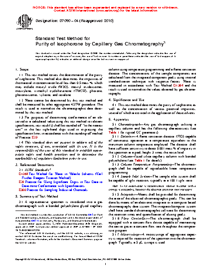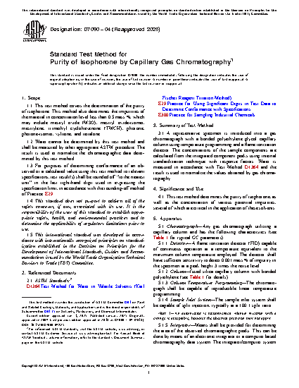 1.1 This test method covers the determination of the purity of isophorone. This method also determines the impurities of the material in concentration level less than 0.5 mass %, which may include mesityl oxide (MSO), mesityl oxide-isomer, mesitylene, trimethyl cyclohexenone (TMCH), phorone, phorone-isomer, xylitone, and tetralone.