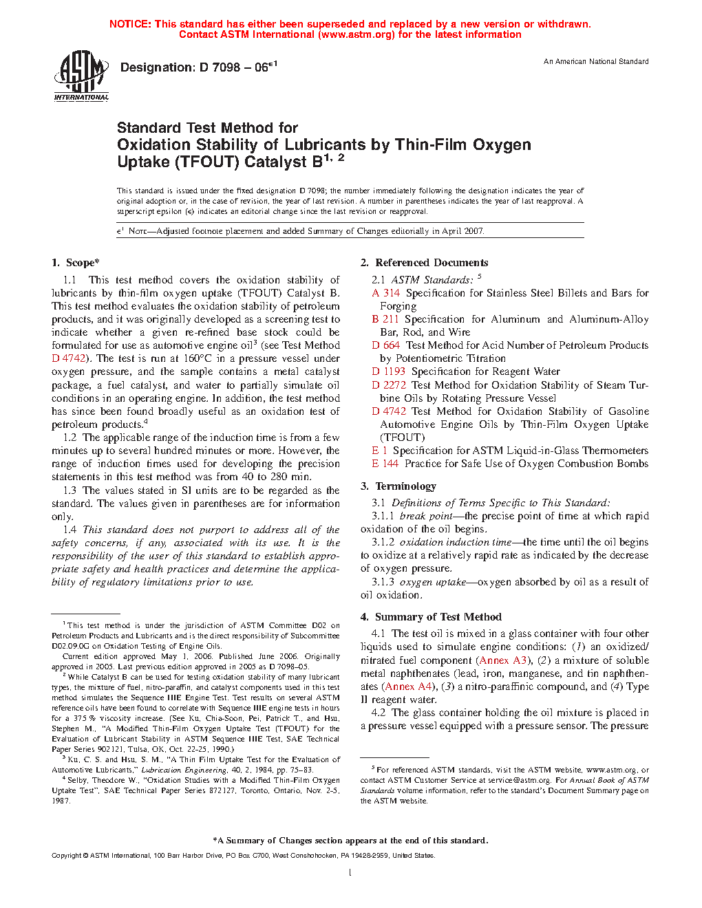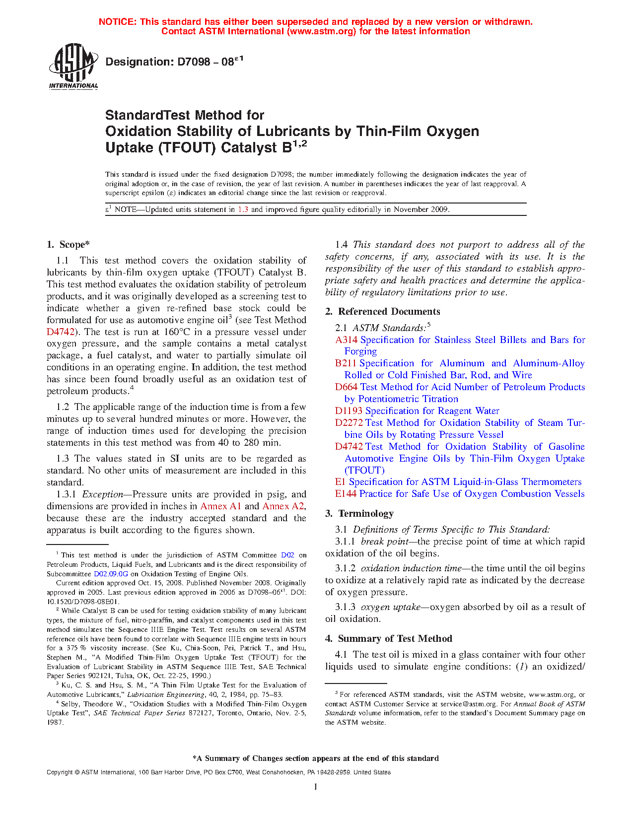 1.1 This test method covers the oxidation stability of lubricants by thin-film oxygen uptake (TFOUT) Catalyst B. This test method evaluates the oxidation stability of petroleum products, and it was originally developed as a screening test to indicate whether a given re-refined base stock could be formulated for use as automotive engine oil3 (see Test Method D4742). The test is run at 160 °C in a pressure vessel under oxygen pressure, and the sample contains a metal catalyst package, a fuel catalyst, and water to partially simulate oil conditions in an operating engine. In addition, the test method has since been found broadly useful as an oxidation test of petroleum products.4
