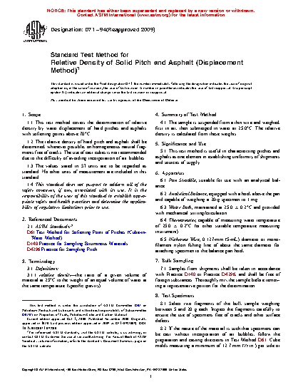 1.1 This test method covers the determination of relative density by water displacement of hard pitches and asphalts with softening points above 70 °C.