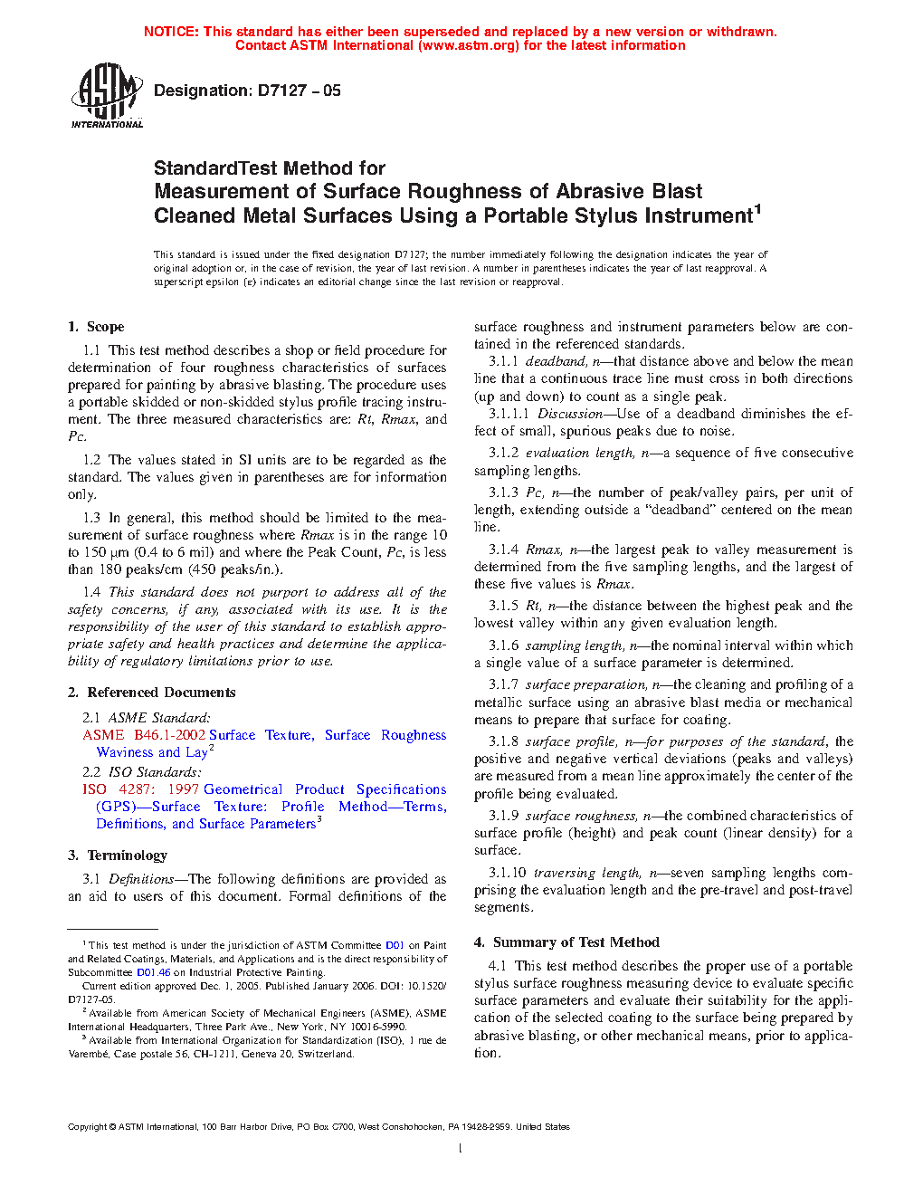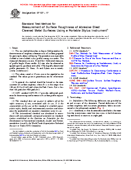 1.1 This test method describes a shop or field procedure for determination of roughness characteristics of surfaces prepared for painting by abrasive blasting. The procedure uses a portable skidded or non-skidded stylus profile tracing instrument. The measured characteristics are: Rt and Rpc. Additional measures of profile height (Rmax and/or Rz) may also be obtained as agreed upon by purchaser and seller. (The digitally-determined profile parameters Rt, Rmax, Ry and Rzlmax are extremely similar in definition.)