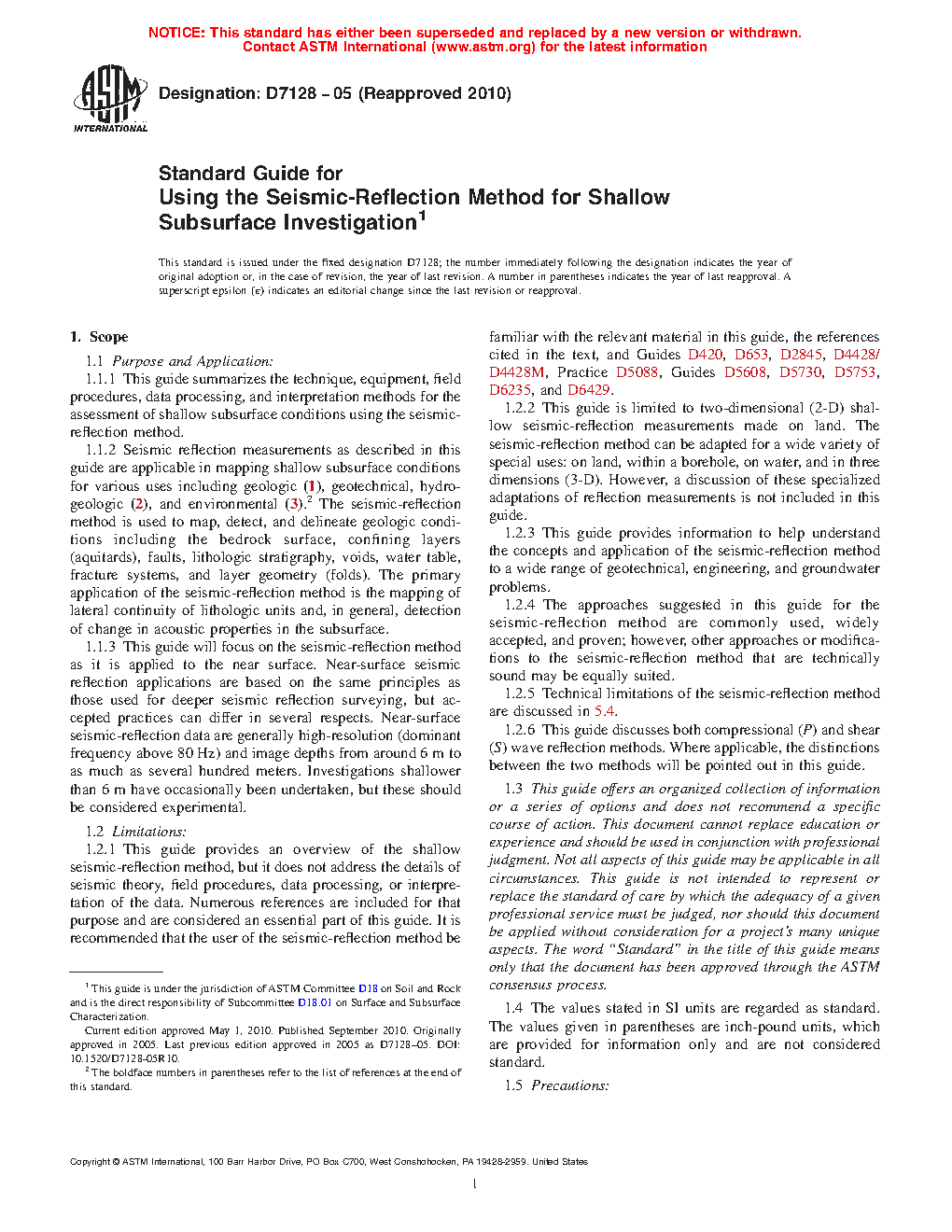 1.2.1 This guide provides an overview of the shallow seismic-reflection method, but it does not address the details of seismic theory, field procedures, data processing, or interpretation of the data. Numerous references are included for that purpose and are considered an essential part of this guide. It is recommended that the user of the seismic-reflection method be familiar with the relevant material in this guide, the references cited in the text, and Guides D420, D653, D2845, D4428/D4428M, Practice D5088, Guides D5608, D5730, D5753, D6235, and D6429.