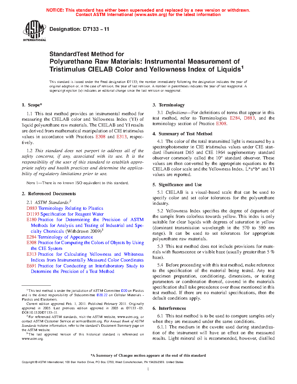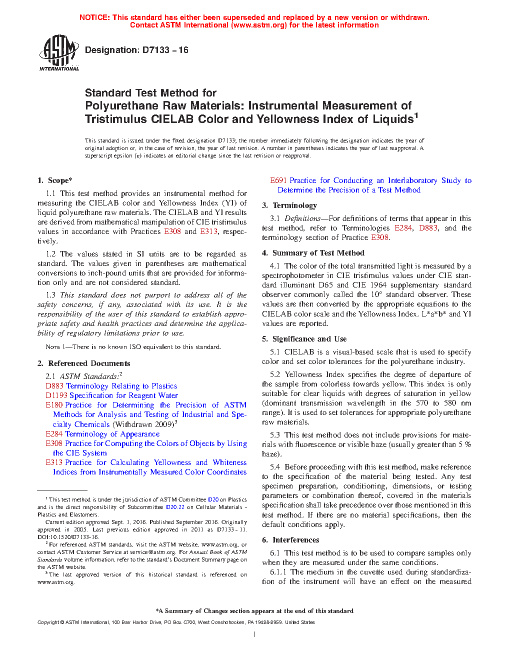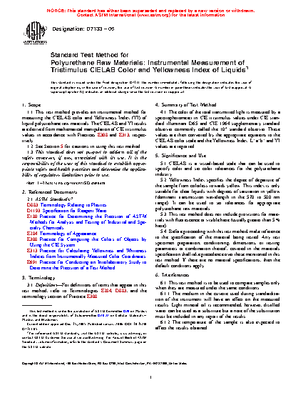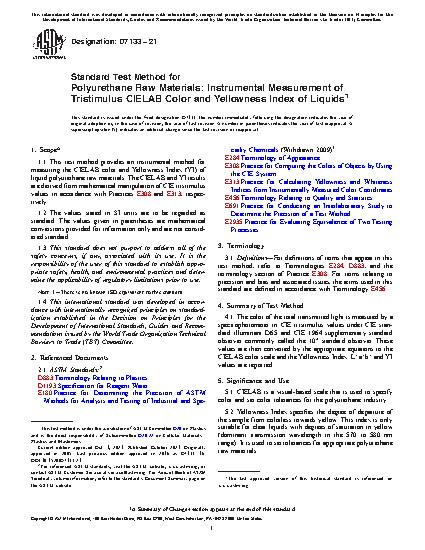 1.1 This test method provides an instrumental method for measuring the CIELAB color and Yellowness Index (YI) of liquid polyurethane raw materials. The CIELAB and YI results are derived from mathematical manipulation of CIE tristimulus values in accordance with Practices E308 and E313, respectively.