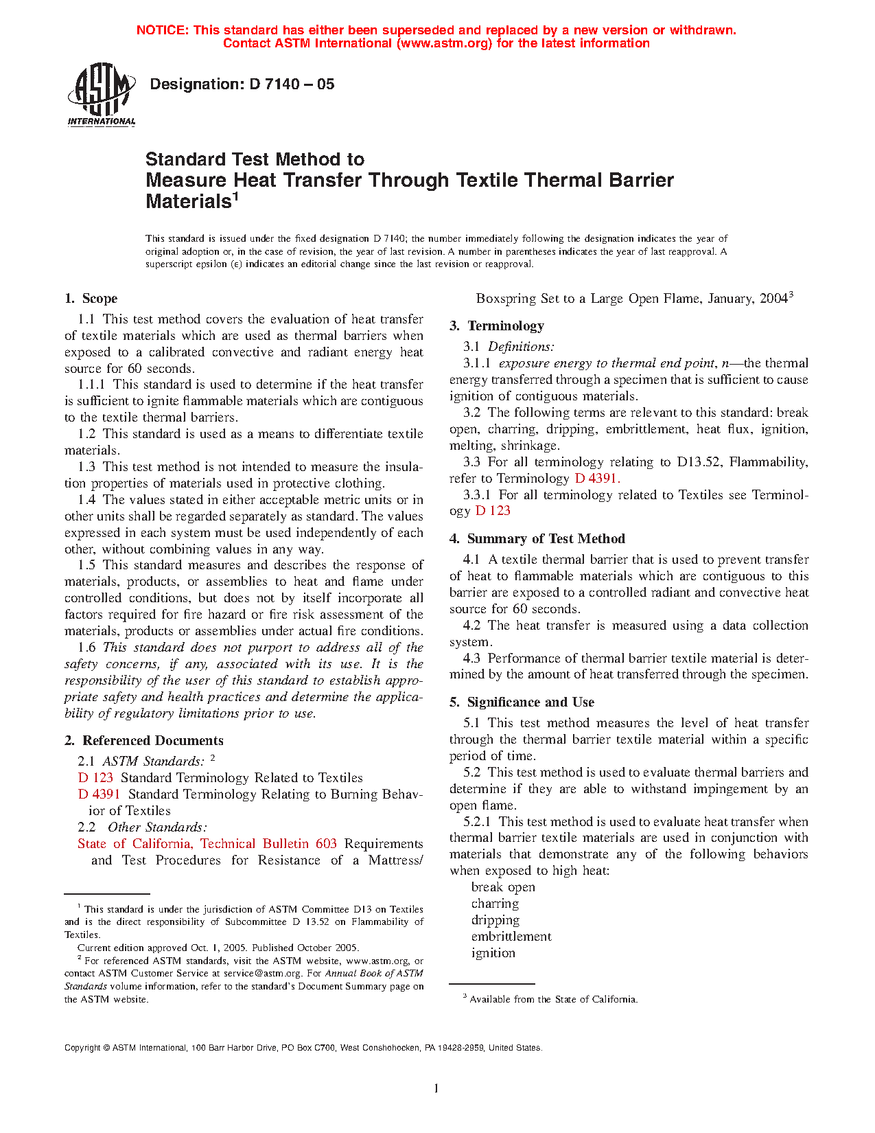 1.1 This test method covers the evaluation of heat transfer of textile materials which are used as thermal barriers when exposed to a calibrated convective and radiant energy heat source for 60 seconds.