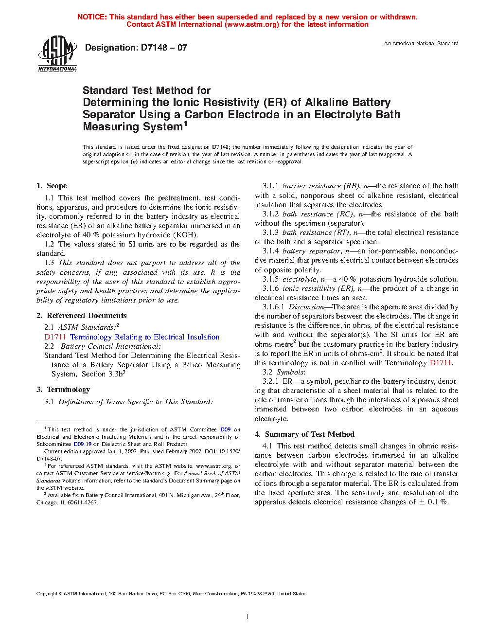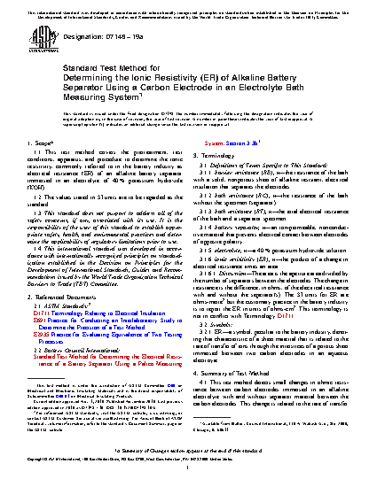 1.1 This test method covers the pretreatment, test conditions, apparatus, and procedure to determine the ionic resistivity, commonly referred to in the battery industry as electrical resistance (ER) of an alkaline battery separator immersed in an electrolyte of 40 % potassium hydroxide (KOH).