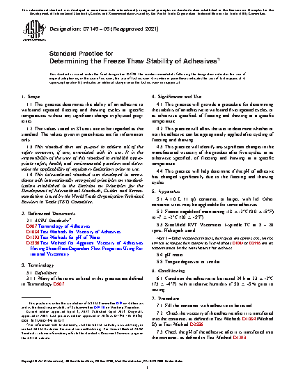 This practice will provide a procedure for determining the stability of an adhesive to withstand five repeated cycles, or as otherwise specified, of freezing and thawing at a specific temperature.