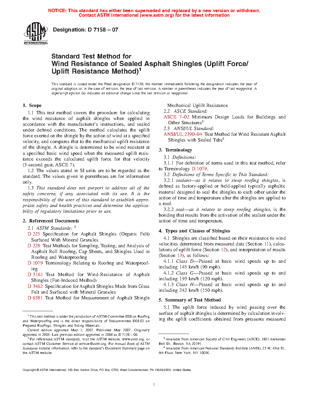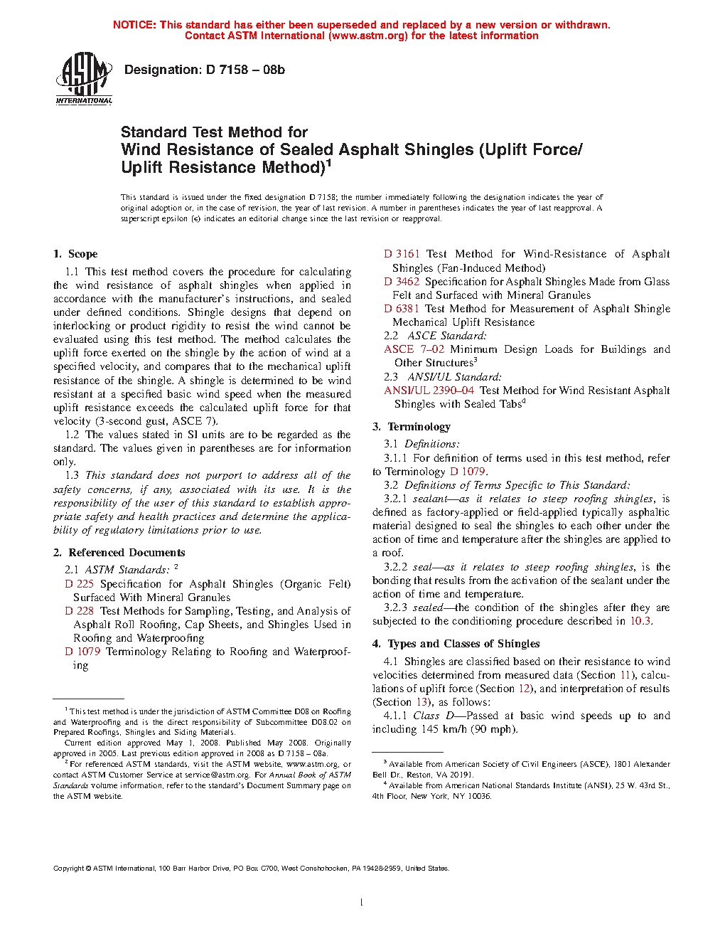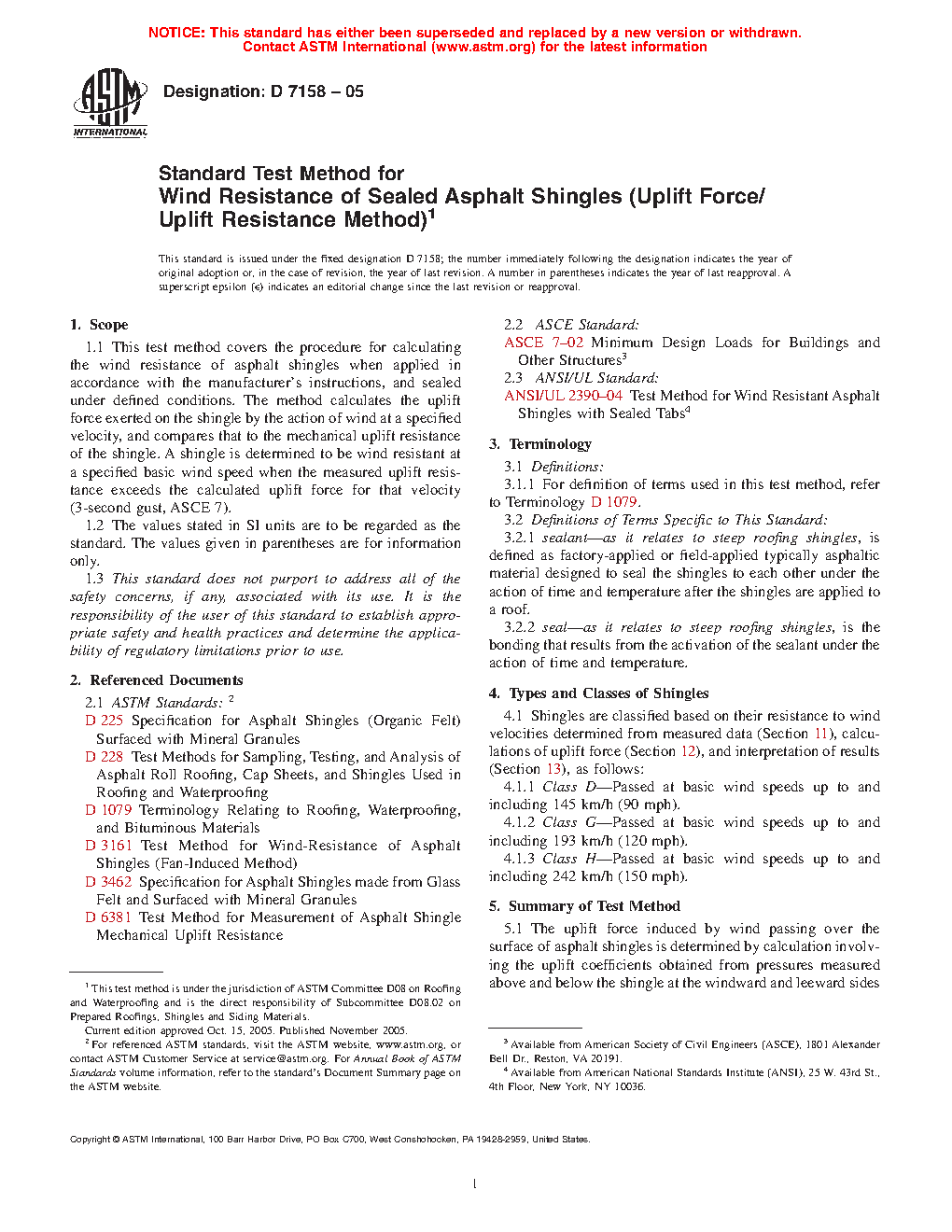 The wind resistance of sealed asphalt shingles is directly related to the ability of the sealed shingle to resist the force of the wind acting to lift the shingle from the shingle below. This test method employs the measured resistance of the shingle to mechanical uplift after sealing under defined conditions, in a calculation which determines whether this resistance exceeds the calculated force induced by wind passing over the surface of the shingle. Natural wind conditions differ with respect to intensity, duration, and turbulence; while these conditions were considered, and safety factors introduced, extreme natural variations are beyond the means of this test method to simulate.