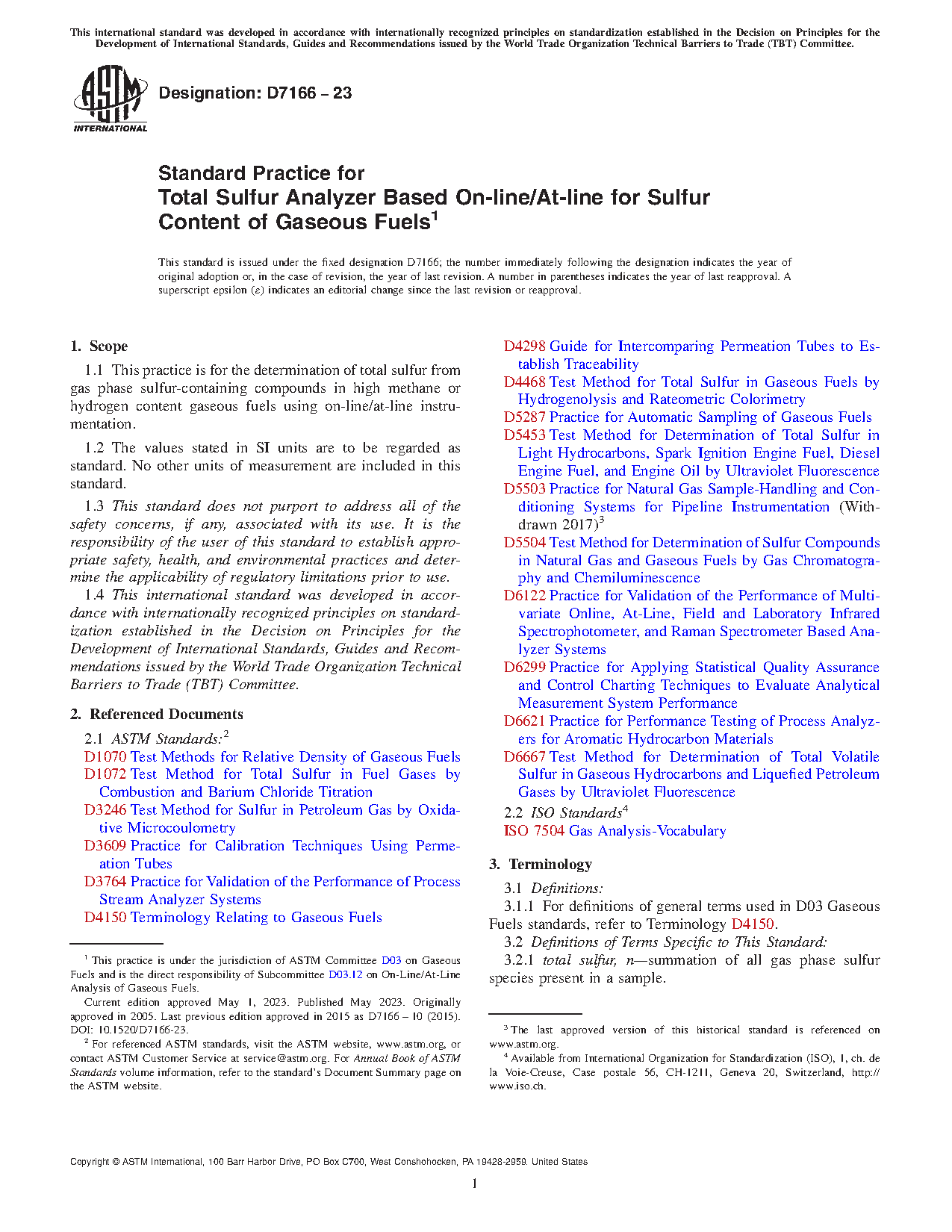 1.1 This practice is for the determination of total sulfur from gas phase sulfur-containing compounds in high methane or hydrogen content gaseous fuels using on-line/at-line instrumentation.
