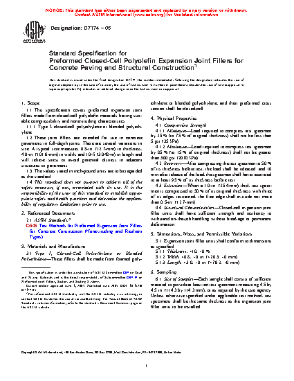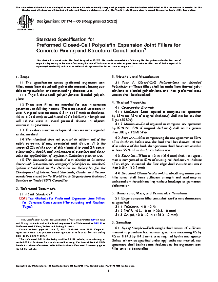 1.1 This specification covers preformed expansion joint fillers made from closed-cell polyolefin materials having suitable compressibility and nonextruding characteristics.
