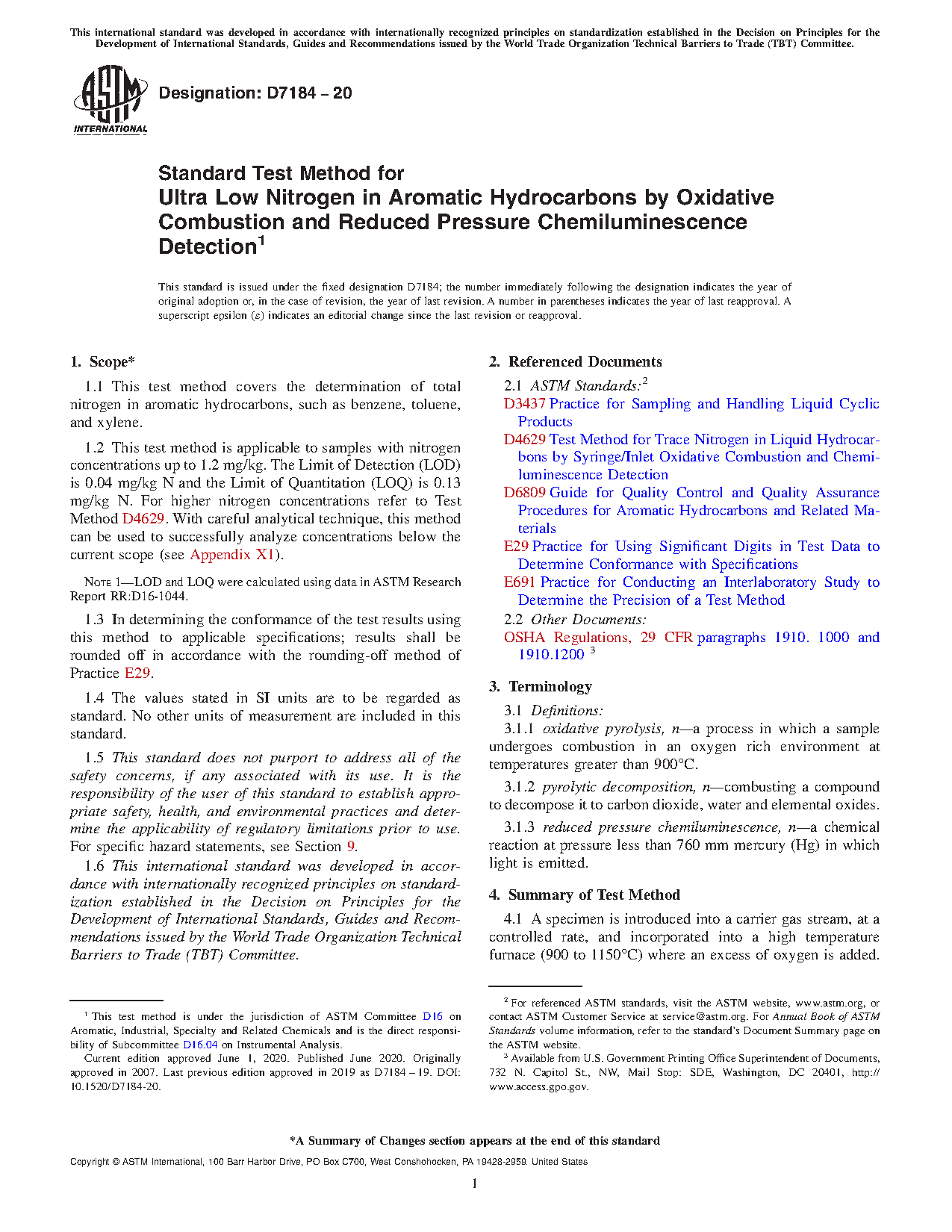 1.2 This test method is applicable to samples with nitrogen concentrations up to 1.2 mg/kg. The Limit of Detection (LOD) is 0.04 mg/kg N and the Limit of Quantitation (LOQ) is 0.13 mg/kg N. For higher nitrogen concentrations refer to Test Method D4629. With careful analytical technique, this method can be used to successfully analyze concentrations below the current scope (see Appendix X1).