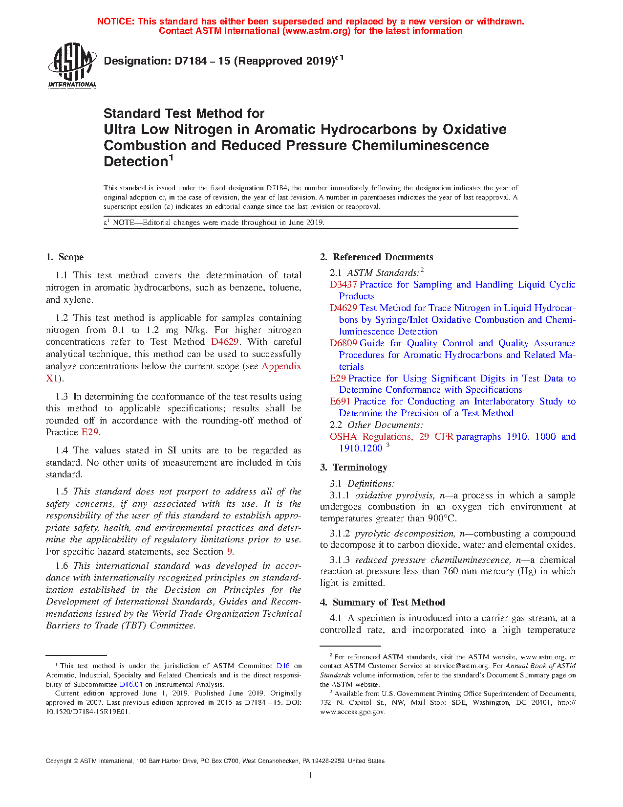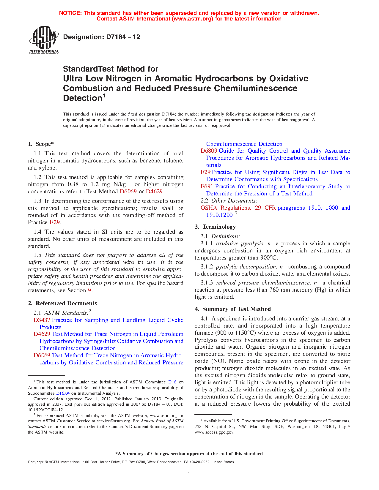 5.1 This test method is useful to detect and quantify nitrogen-containing compounds at a concentration of 0.1 mg N/kg to 1.2 mg N/kg in light aromatic hydrocarbons used or produced in manufacturing process. These nitrogen-containing compounds are undesirable in finished aromatic products and may be used in setting specification for determining the total nitrogen content in aromatic hydrocarbons.