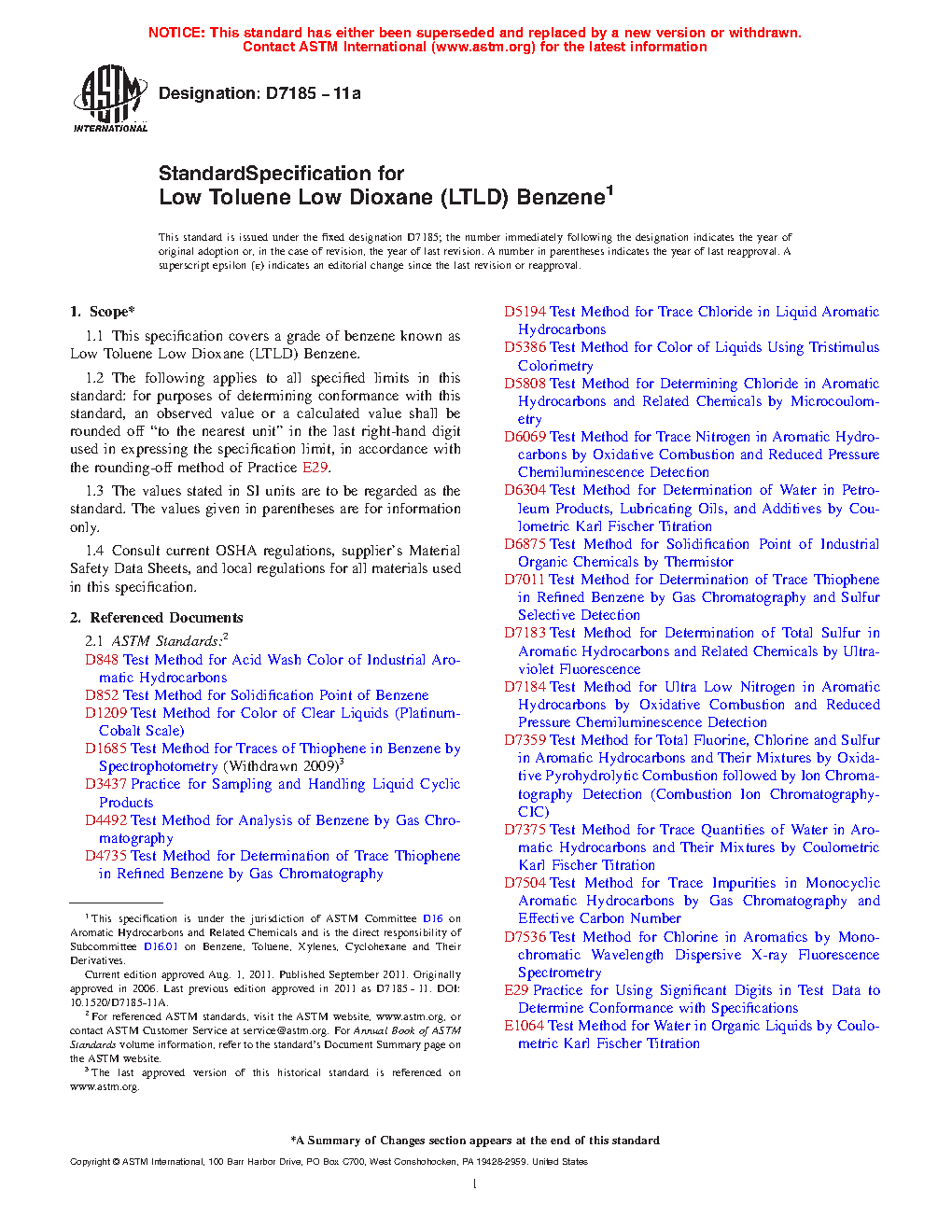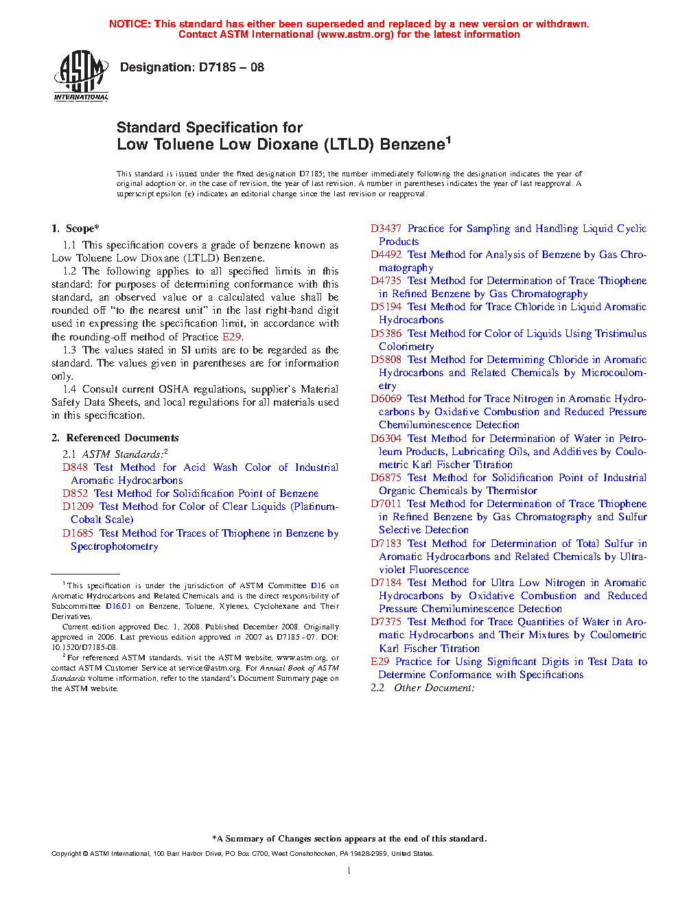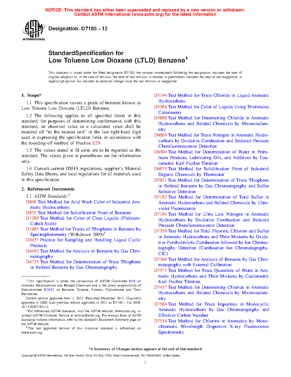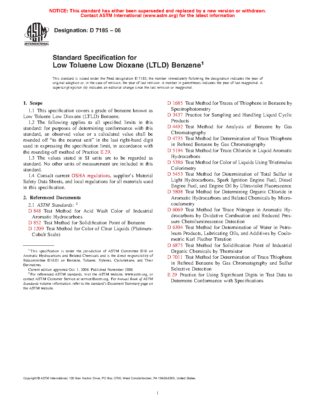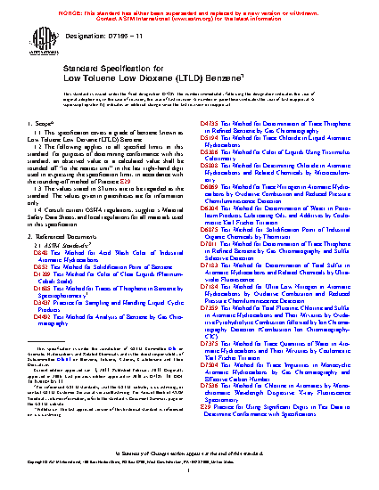 1.1 This specification covers a grade of benzene known as Low Toluene Low Dioxane (LTLD) Benzene.