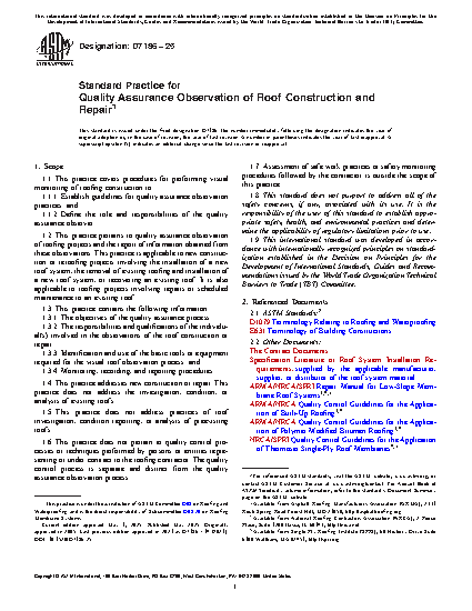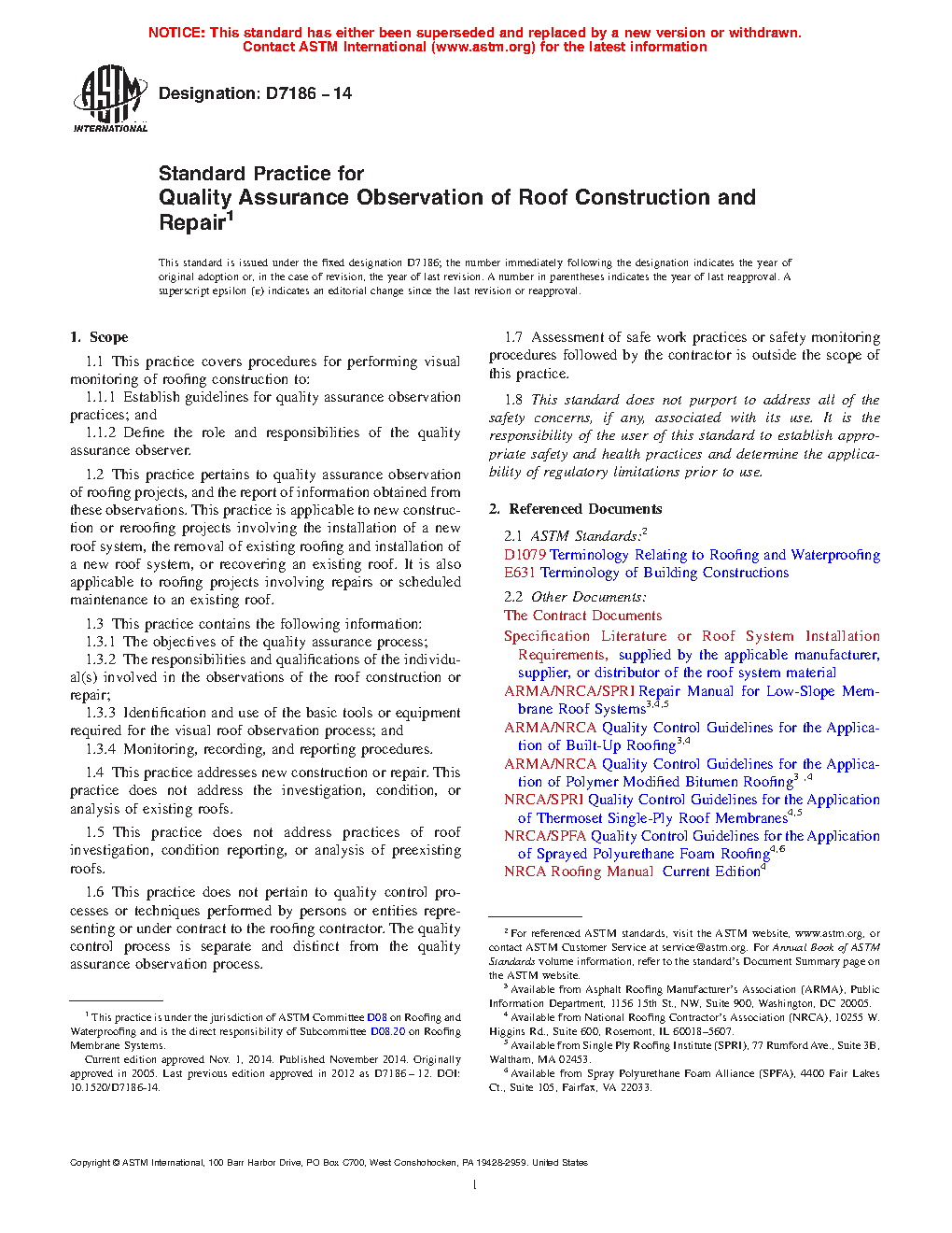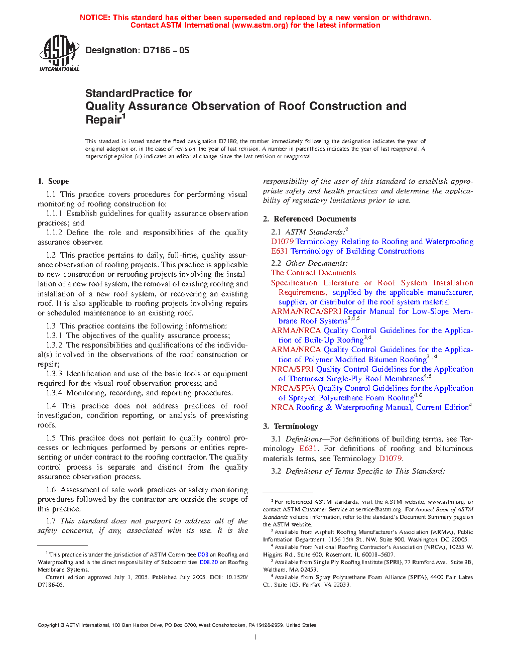 4.3 This practice establishes the role and responsibilities of those performing quality assurance observation and includes qualifications of the quality assurance observer, as well as procedures for observation and documentation during the roof construction or repair process.