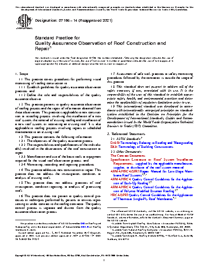 1.2 This practice pertains to quality assurance observation of roofing projects and the report of information obtained from these observations. This practice is applicable to new construction or reroofing projects involving the installation of a new roof system, the removal of existing roofing and installation of a new roof system, or recovering an existing roof. It is also applicable to roofing projects involving repairs or scheduled maintenance to an existing roof.