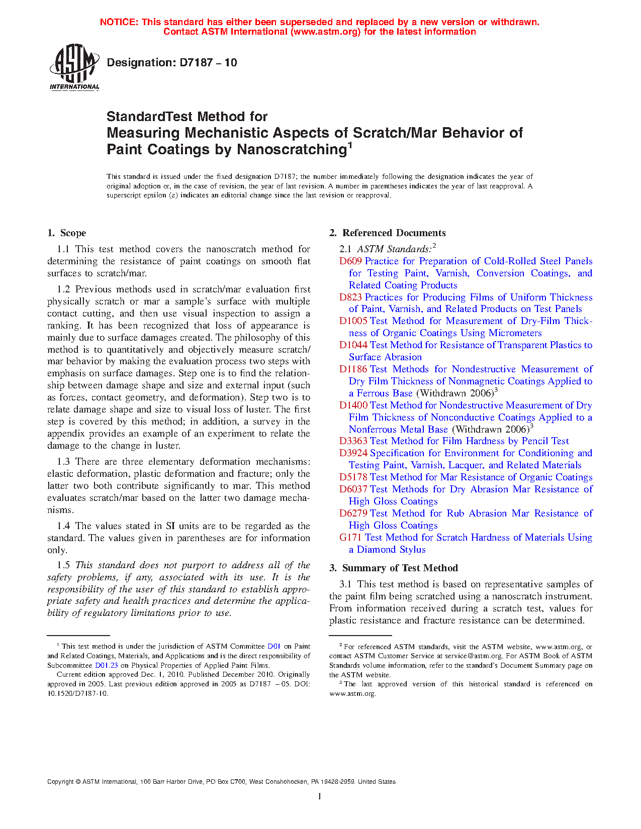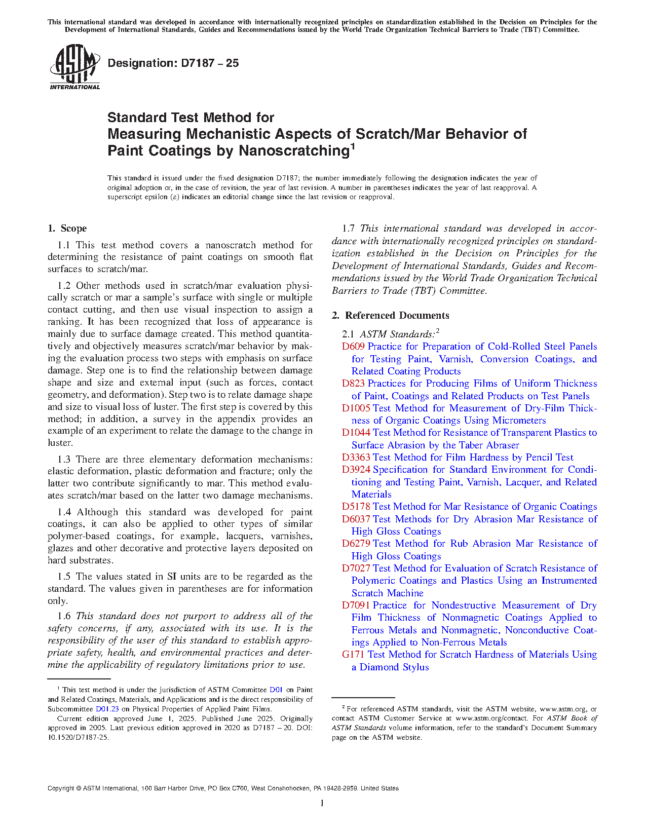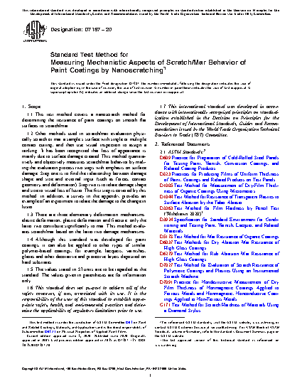 1.1 This test method covers a nanoscratch method for determining the resistance of paint coatings on smooth flat surfaces to scratch/mar.