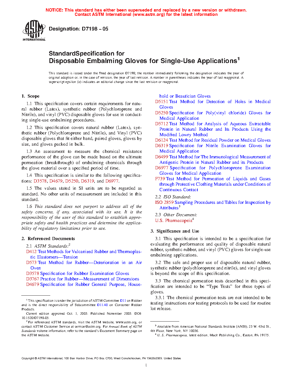 1.1 This specification covers certain requirements for natural rubber (Latex), synthetic rubber (Polychloroprene and Nitrile), and vinyl (PVC) disposable gloves for use in conducting single-use embalming procedures.