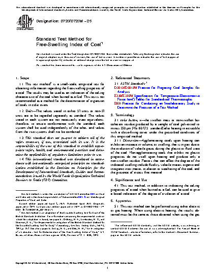 1.1 This test method2 is a small-scale, empirical test for obtaining information regarding the free-swelling properties of a coal. The results may be used as an indication of the caking characteristic of the coal when burned as a fuel. This test is not recommended as a method for the determination of expansion of coals in coke ovens.
