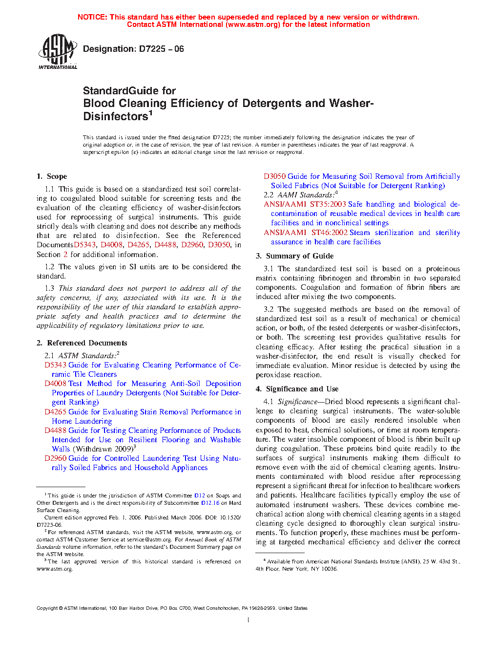 1.1 This guide is based on a standardized test soil correlating to coagulated blood suitable for screening tests and the evaluation of the cleaning efficiency of washer-disinfectors used for reprocessing of surgical instruments. This guide strictly deals with cleaning and does not describe any methods that are related to disinfection. See the Referenced Documents D5343, D4008, D4265, D4488, D2960, D3050, in Section 2 for additional information.