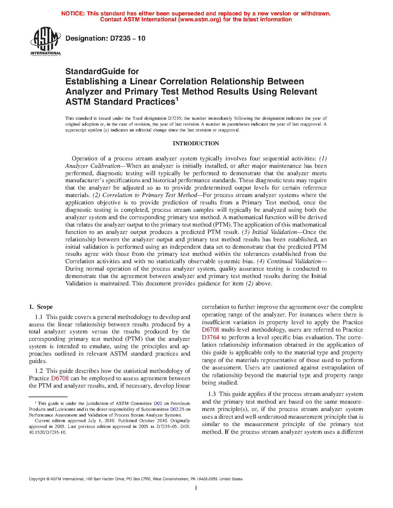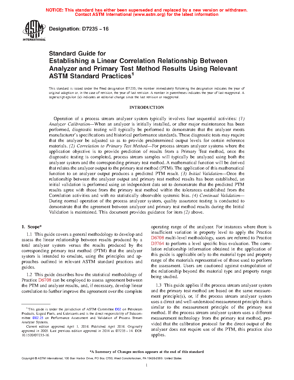 1.2 This guide describes how the statistical methodology of Practice D6708 can be employed to assess agreement between the PTM and analyzer results, and, if necessary, develop linear correlation to further improve the agreement over the complete operating range of the analyzer. For instances where there is insufficient variation in property level to apply the Practice D6708 multi-level methodology, users are referred to Practice D3764 to perform a level specific bias evaluation. The correlation relationship information obtained in the application of this guide is applicable only to the material type and property range of the materials representative of those used to perform the assessment. Users are cautioned against extrapolation of the relationship beyond the material type and property range being studied.