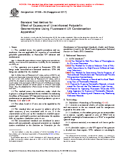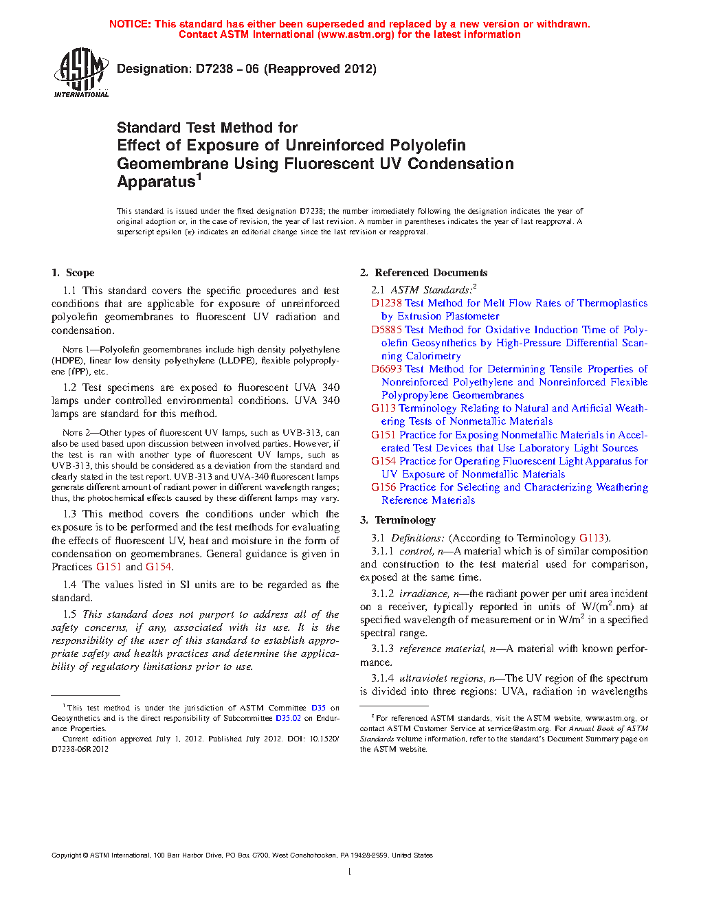 1.3 This method covers the conditions under which the exposure is to be performed and the test methods for evaluating the effects of fluorescent UV, heat and moisture in the form of condensation on geomembranes. General guidance is given in Practices G151 and G154.