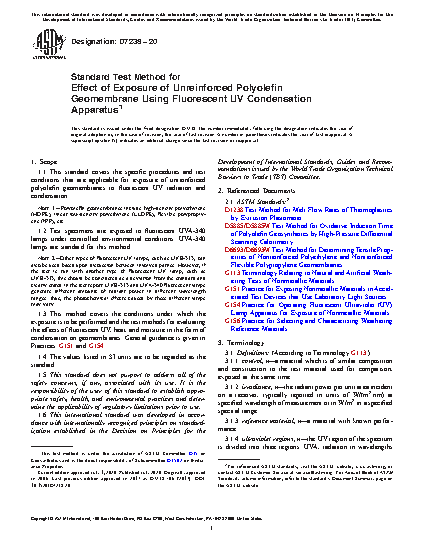 1.1 This standard covers the specific procedures and test conditions that are applicable for exposure of unreinforced polyolefin geomembranes to fluorescent UV radiation and condensation.