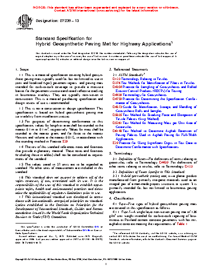 1.1 This is a material specification covering hybrid geosynthetic paving mats typically used for, but not limited to, use in joint and localized (spot) pavement repairs; and paving mats intended for curb-to-curb coverage to provide a moisture barrier for the pavement structure and retard reflective cracking in bituminous overlays. They are typically non-woven in construction. This is a material purchasing specification and design review of use is recommended.