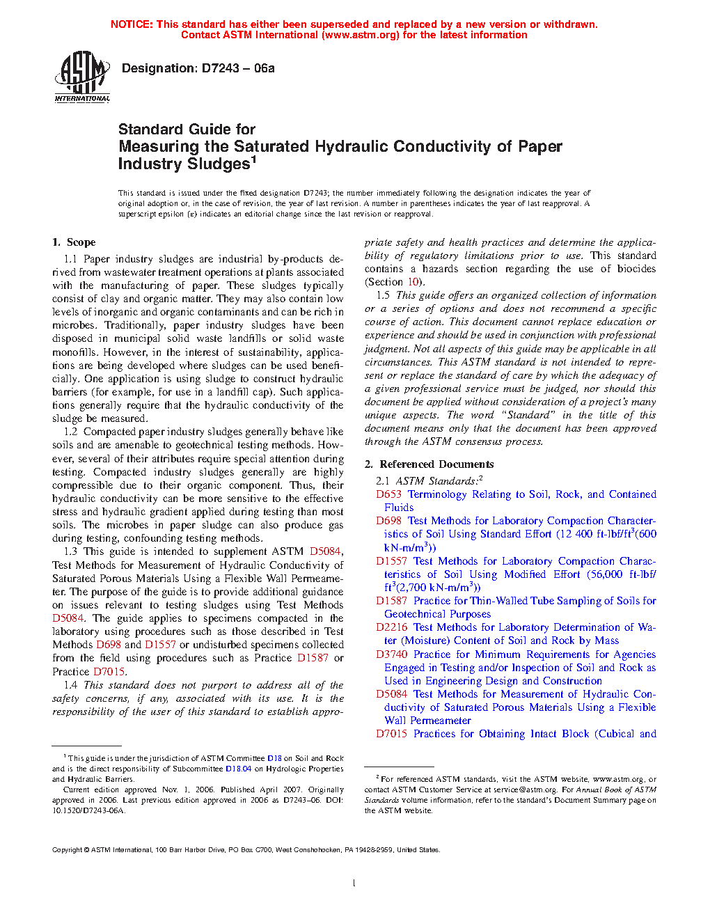 1.3 This guide is intended to supplement ASTM D5084, Test Methods for Measurement of Hydraulic Conductivity of Saturated Porous Materials Using a Flexible Wall Permeameter. The purpose of the guide is to provide additional guidance on issues relevant to testing sludges using Test Methods D5084. The guide applies to specimens compacted in the laboratory using procedures such as those described in Test Methods D698 and D1557 or undisturbed specimens collected from the field using procedures such as Practice D1587/D1587M or Practice D7015/D7015M.