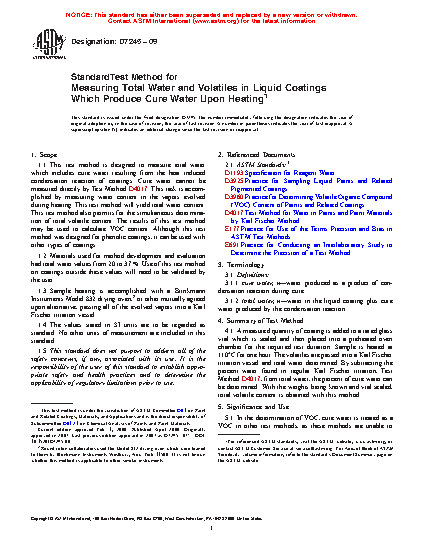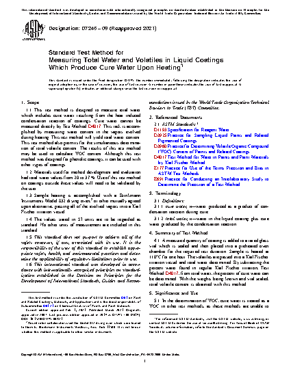 1.1 This test method is designed to measure total water which includes cure water resulting from the heat induced condensation reaction of coatings. Cure water cannot be measured directly by Test Method D4017. This task is accomplished by measuring water content in the vapors evolved during heating. This test method will yield total water content. This test method also permits for the simultaneous determination of total volatile content. The results of this test method may be used to calculate VOC content. Although this test method was designed for phenolic coatings, it can be used with other types of coatings.