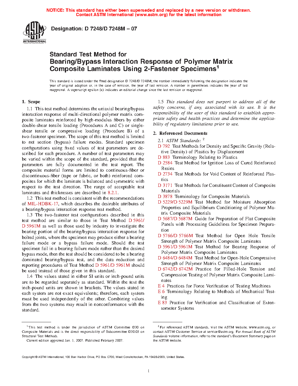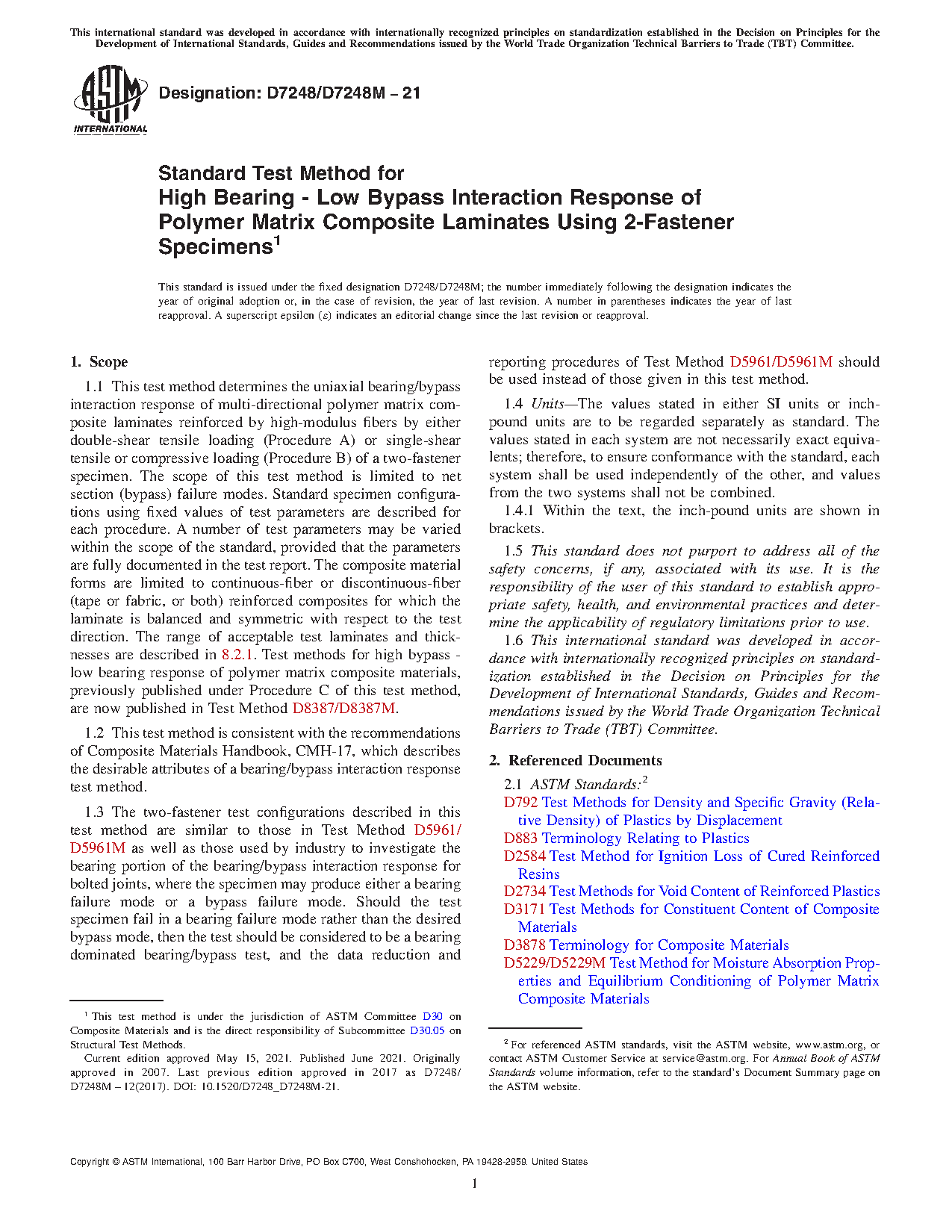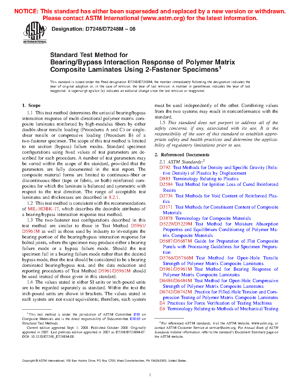 1.2 This test method is consistent with the recommendations of MIL-HDBK-17, which describes the desirable attributes of a bearing/bypass interaction response test method.