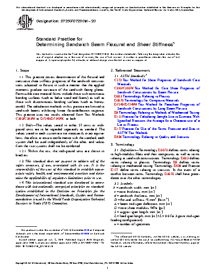 1.1 This practice covers determination of the flexural and transverse shear stiffness properties of flat sandwich constructions subjected to flexure in such a manner that the applied moments produce curvature of the sandwich facing planes. Permissible core material forms include those with continuous bonding surfaces (such as balsa wood and foams) as well as those with discontinuous bonding surfaces (such as honeycomb). The calculation methods in this practice are limited to sandwich beams exhibiting linear force-deflection response. This practice uses test results obtained from Test Methods C 393/C 393M and/or D 7249/D 7249M.