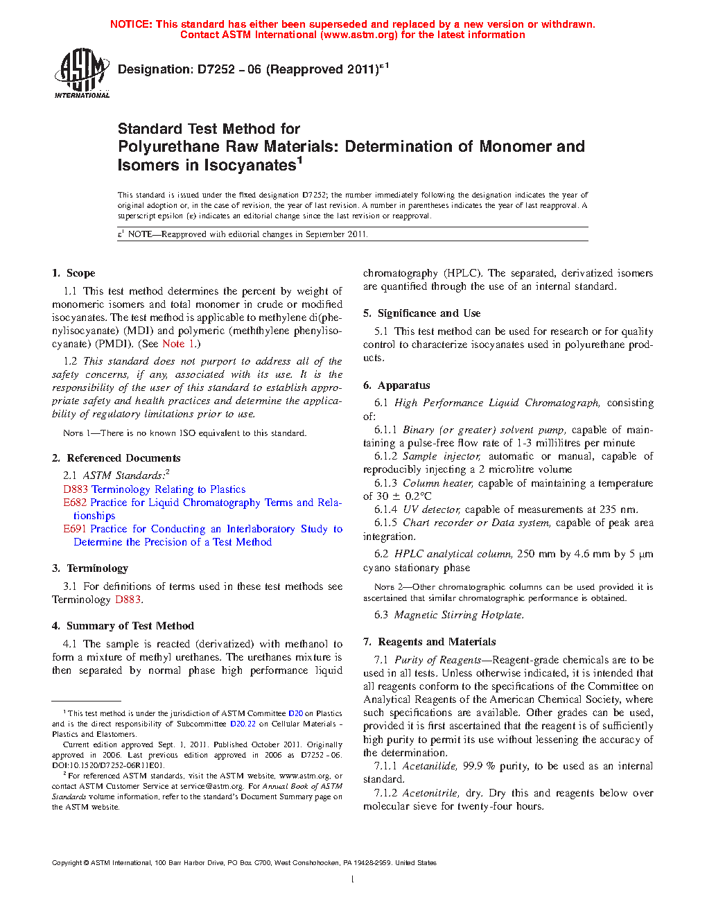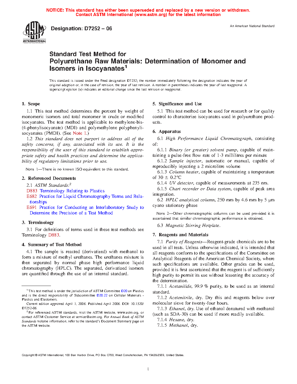 1.1 This test method determines the percent by weight of monomeric isomers and total monomer in crude or modified isocyanates. The test method is applicable to methylene di(phenylisocyanate) (MDI) and polymeric (meththylene phenylisocyanate) (PMDI). (See Note 1.)