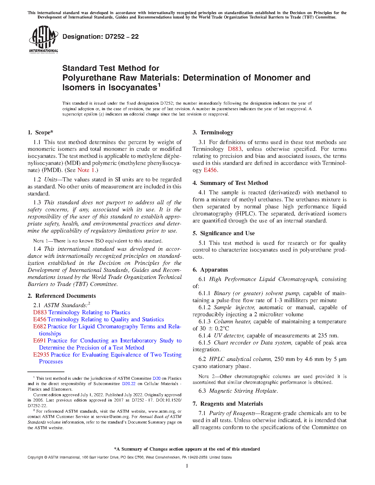 1.1 This test method determines the percent by weight of monomeric isomers and total monomer in crude or modified isocyanates. The test method is applicable to methylene di(phenylisocyanate) (MDI) and polymeric (methylene phenylisocyanate) (PMDI). (See Note 1.)