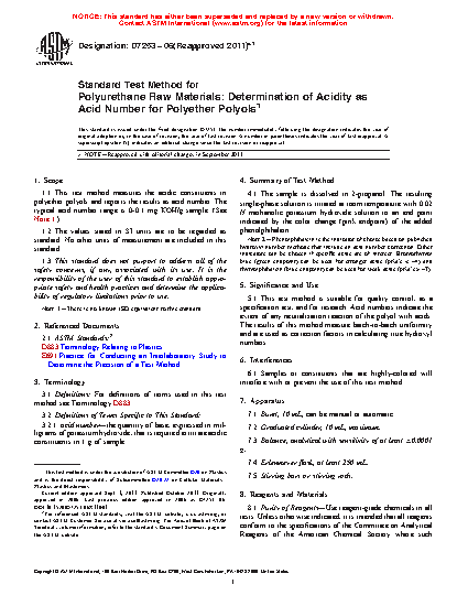 1.1 This test method measures the acidic constituents in polyether polyols and reports the results as acid number. The typical acid number range is 0-0.1 mg KOH/g sample. (See Note 1.)