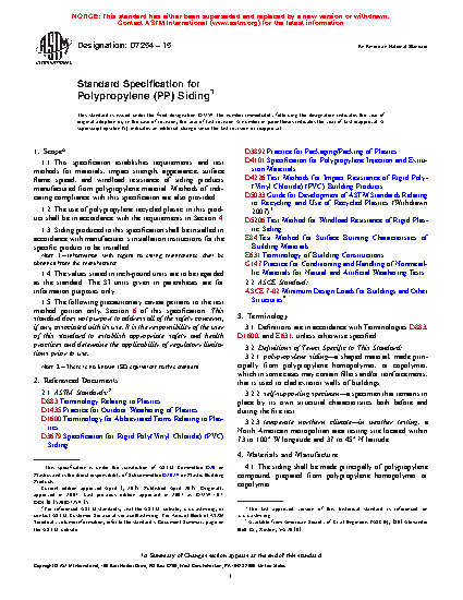 This specification establishes requirements and test methods for materials, impact strength, appearance, surface flame spread, and windload resistance of siding products manufactured from polypropylene material. The use of polypropylene recycled plastic in this product shall conform to the specified requirements. The siding shall be made principally of polypropylene compound, prepared from polypropylene homopolymer or copolymer. The polypropylene compound shall be compounded so as to provide the heat stability and weather exposure stability required for the siding market application.